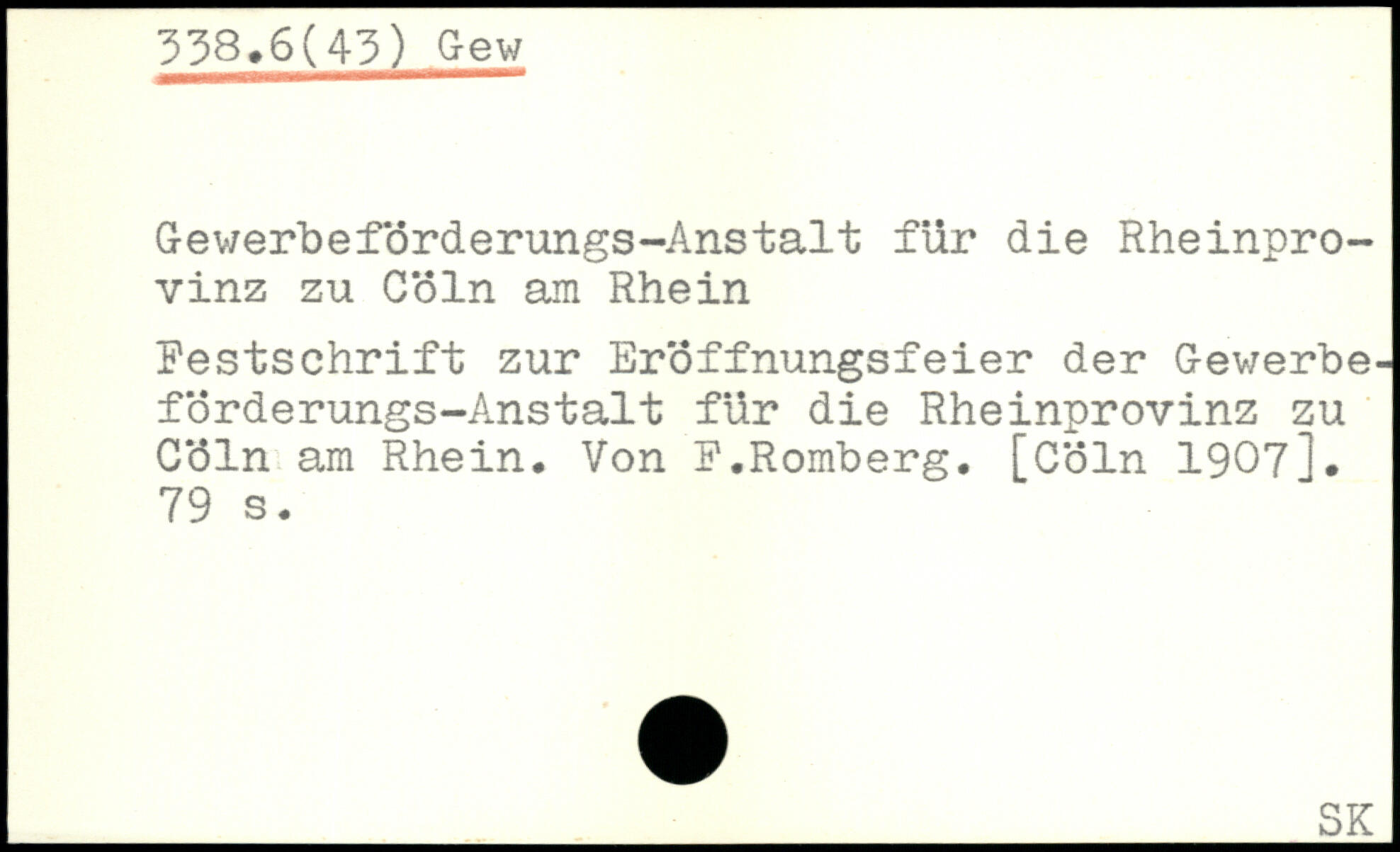 G-ewerbeförderungs-Anstalt für die Rheinprovinz zu Cöln am Rhein Restschrift zur Eröffnungsfeier der Gewerbe-forderungs-Anstalt für die Rheinprovinz zu Cöln am Rhein. Von E.Romberg. [Cöln 1907].