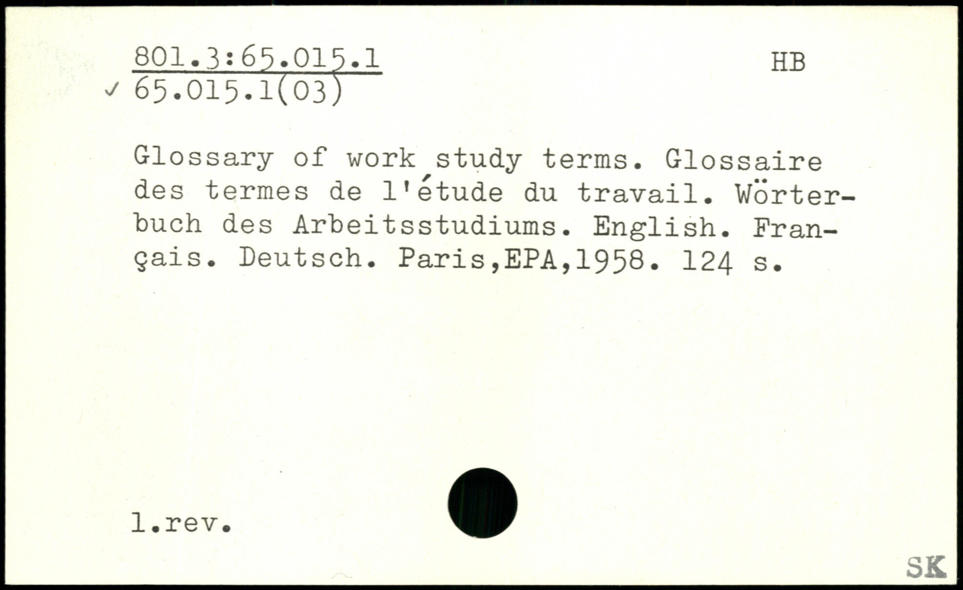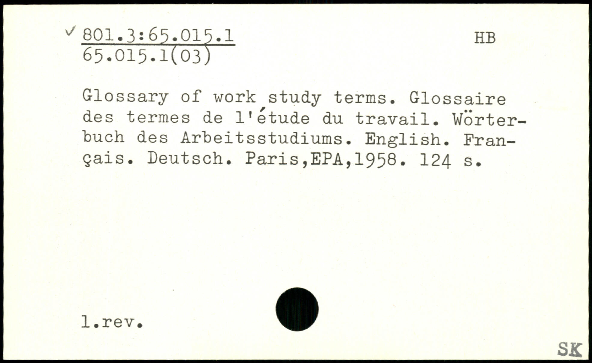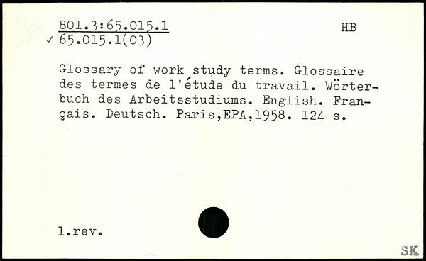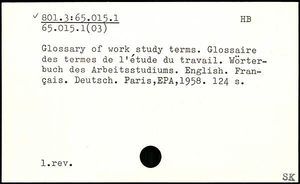 Glossary of work study terms. Glossaire des termes de l’étude du travail. Wörterbuch des Arbeitsstudiums. English. Français. Deutsch.
