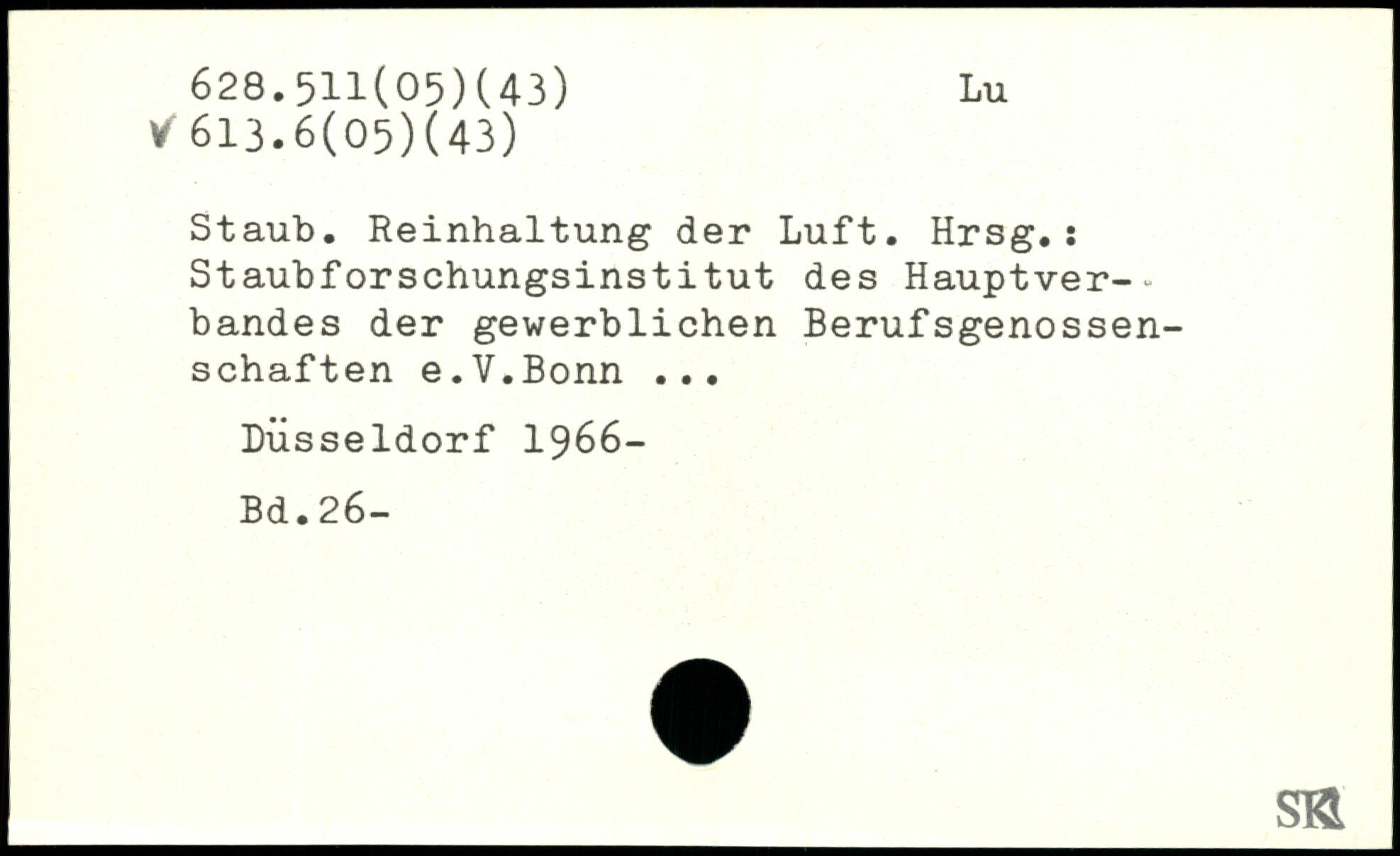 Staub. Reinhaltung der Luft. Hrsg.: Staubforschungsinstitut des Hauptver-, bandes der gewerblichen Berufsgenossenschaften e.V.Bonn ... Düsseldorf 1966-