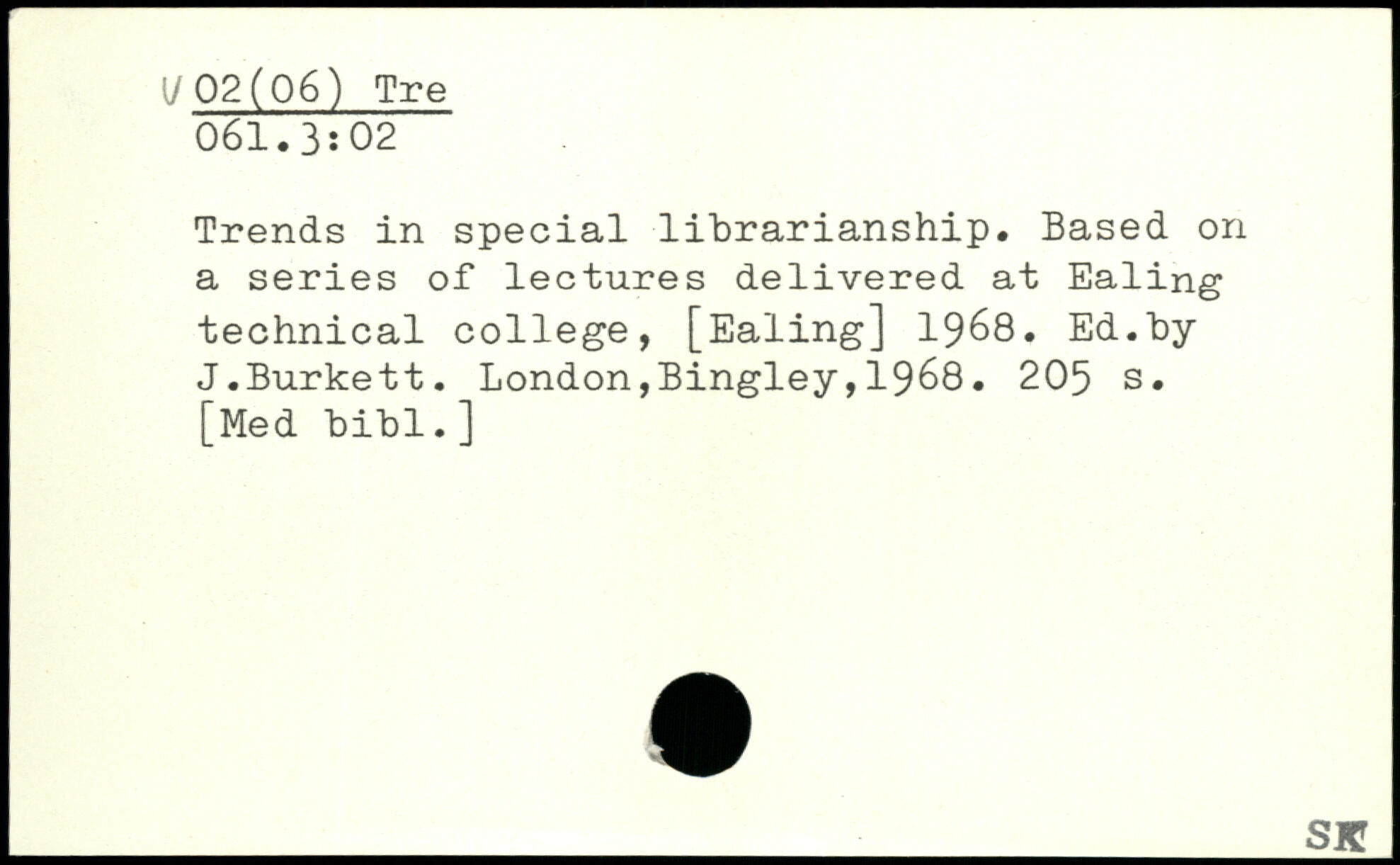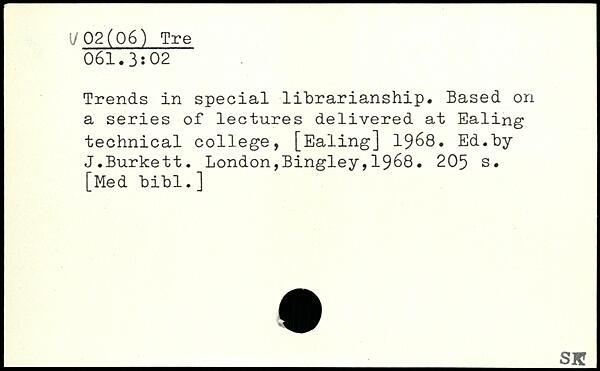 Trends in special librarianship. Based on a series of lectures delivered at Ealing technical college, [Ealing] 1968. Ed.by J.Burkett.