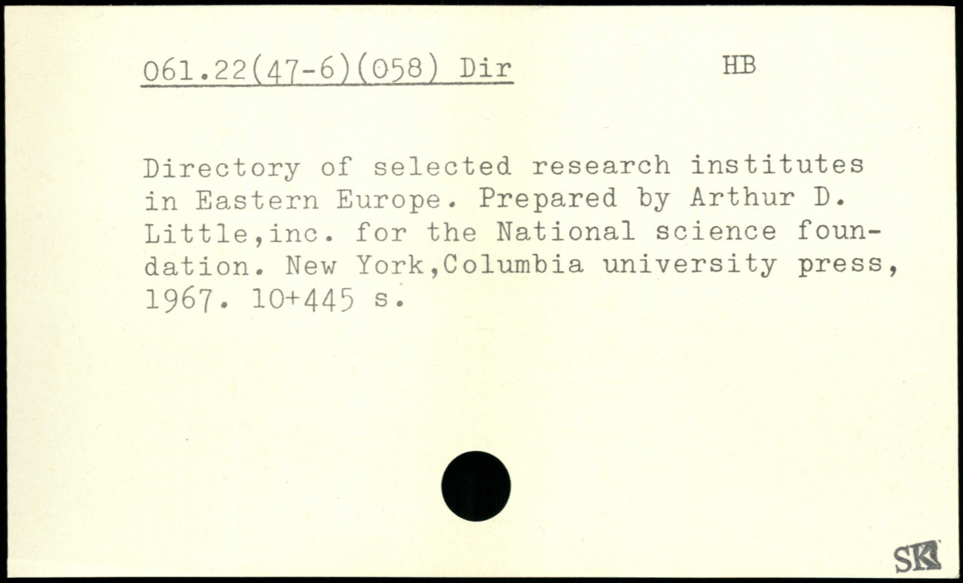 Directory of selected research institutes in Eastern Europe. Prepared by Arthur D. Little,inc. for the National science foundation.