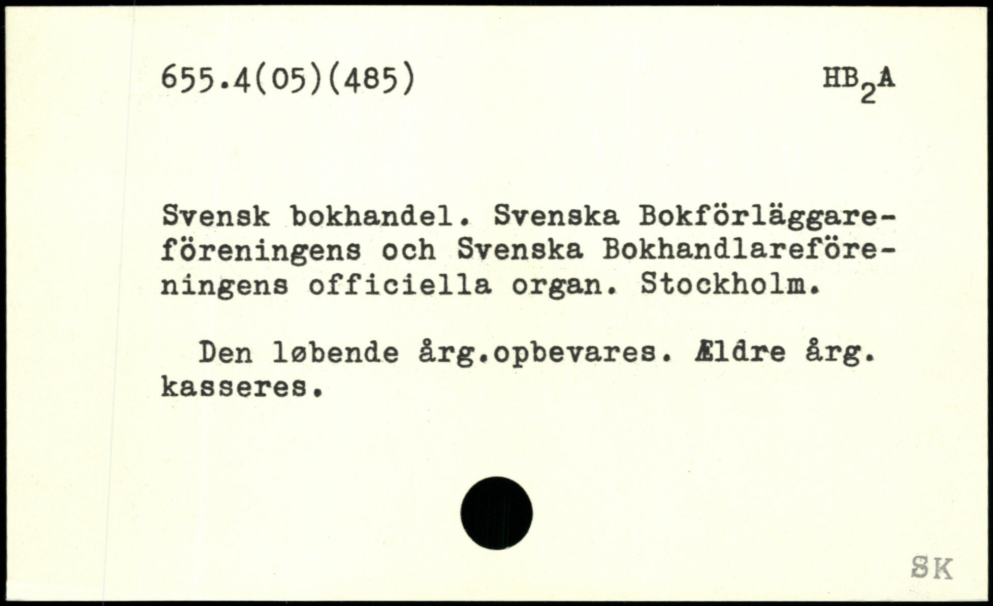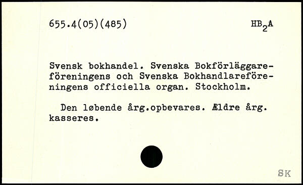 Svensk bokhandel. Svenska Bokförläggare-föreningens och Svenska Bokhandlareföreningens officiella organ. Stockholm. Den løbende årg.opbevares. Ældre årg. kasseres.