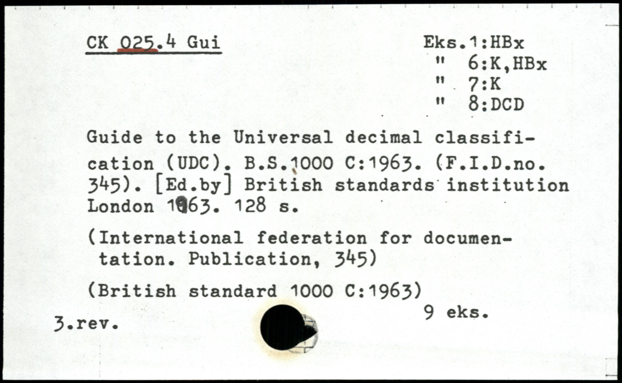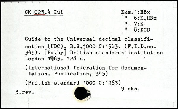 CK qffî.h Gui Eks.lïHBx " 6:K,HBx " 7:K " 8:DCD Guide to the Universal decimal classification (UDC). B.S.1000 Cî1963. (F.I.D.no. 3^5). [Ed.by] British standards institution London 1^63.