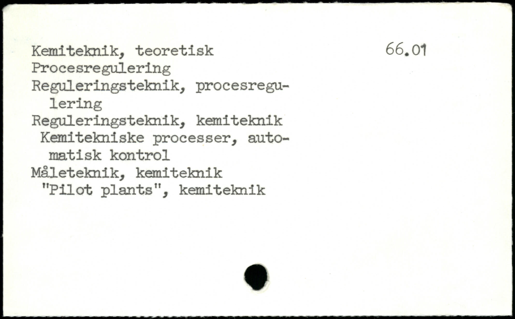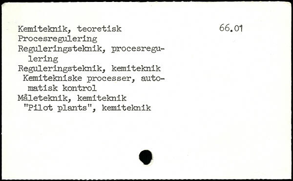 Kemiteknik, teoretisk 66.01 Procesregulering Reguleringsteknik, procesregulering Reguleringsteknik, kemiteknik Kemitekniske processer, automatisk kontrol Måleteknik, kemiteknik "Pilot plants", kemiteknik