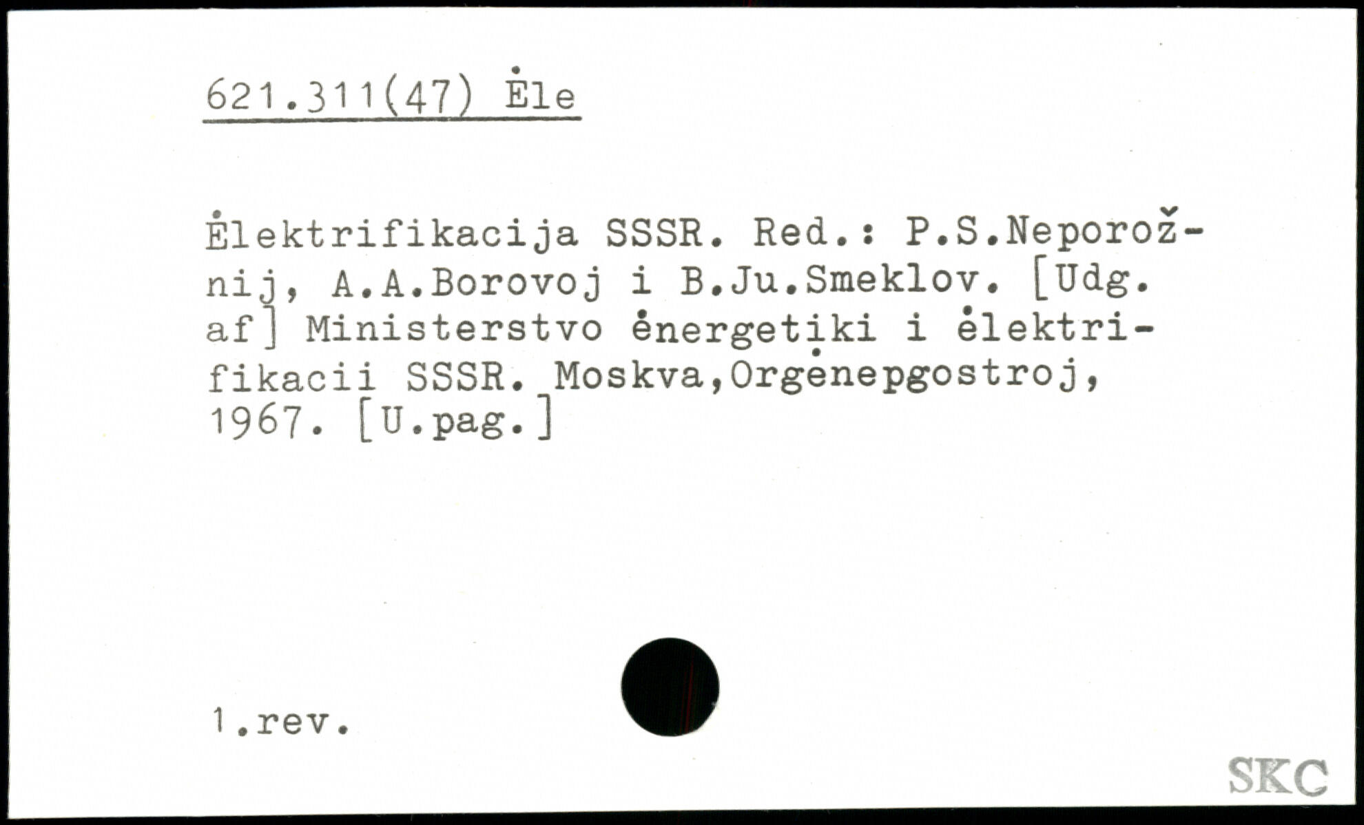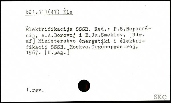 Êlektrifikacija SSSR. Red.; P.S.Neporoz-nij, A.A.Borovoj i B.Ju.Smeklov. [üdg. af J Ministerstvo ênergetiki i elektri-fikacii SSSR. Moskva,Orgênepgostroj, 1967. [U.pag.]