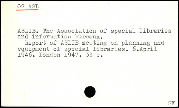 ASLIB. The Association of special libraries and information bureaux. Report of ASLIB meeting on planning and equipment of special libraries. 6.April 1946.