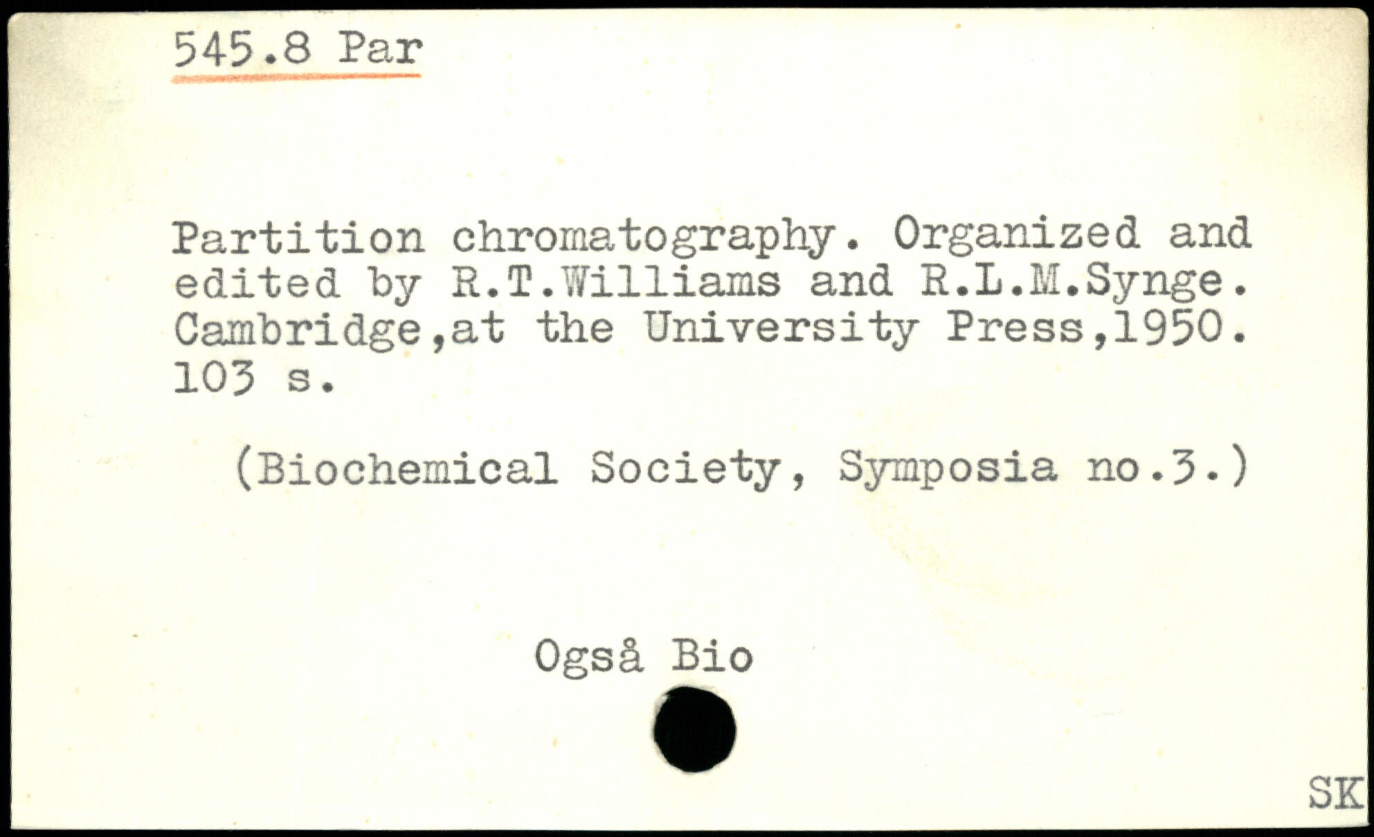 Partition chromatography. Organized and edited by R.T.W1111ams and R.L.M.Synge. Cambridge,at the University Press,1950.