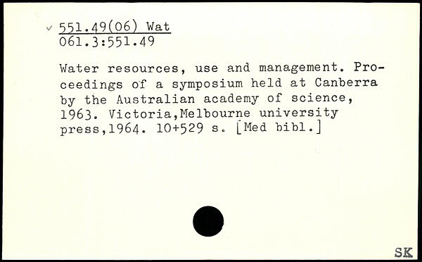 Water resources, use and management. Proceedings of a symposium held at Canberra by the Australian academy of science, 1963.