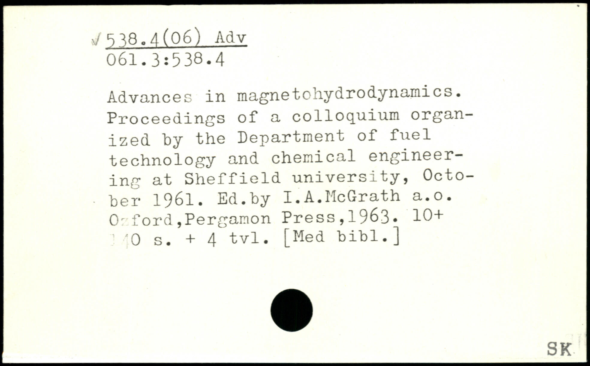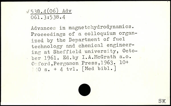 Advances in magnetohydrodynamics. Proceedings of a colloquium organized by the Department of fuel technology and chemical engineering at Sheffield university, Octo-her 1961. Ed.by I.A.McGrath a.o. 0" ford,Pergamon Press,1963, ' '