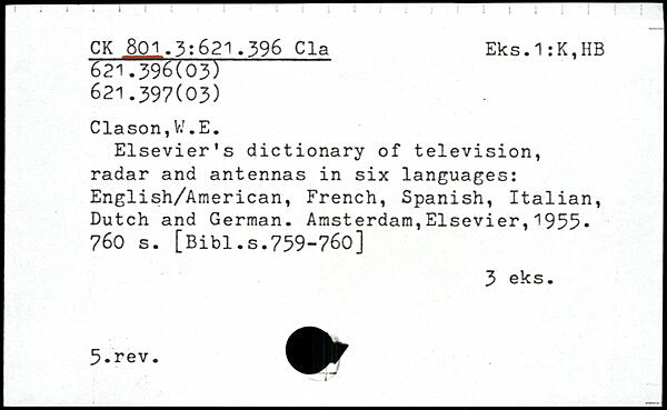Elsevier's dictionary of television, radar and antennas in six languages: English/American, French, Spanish, Italian, Dutch and German.
