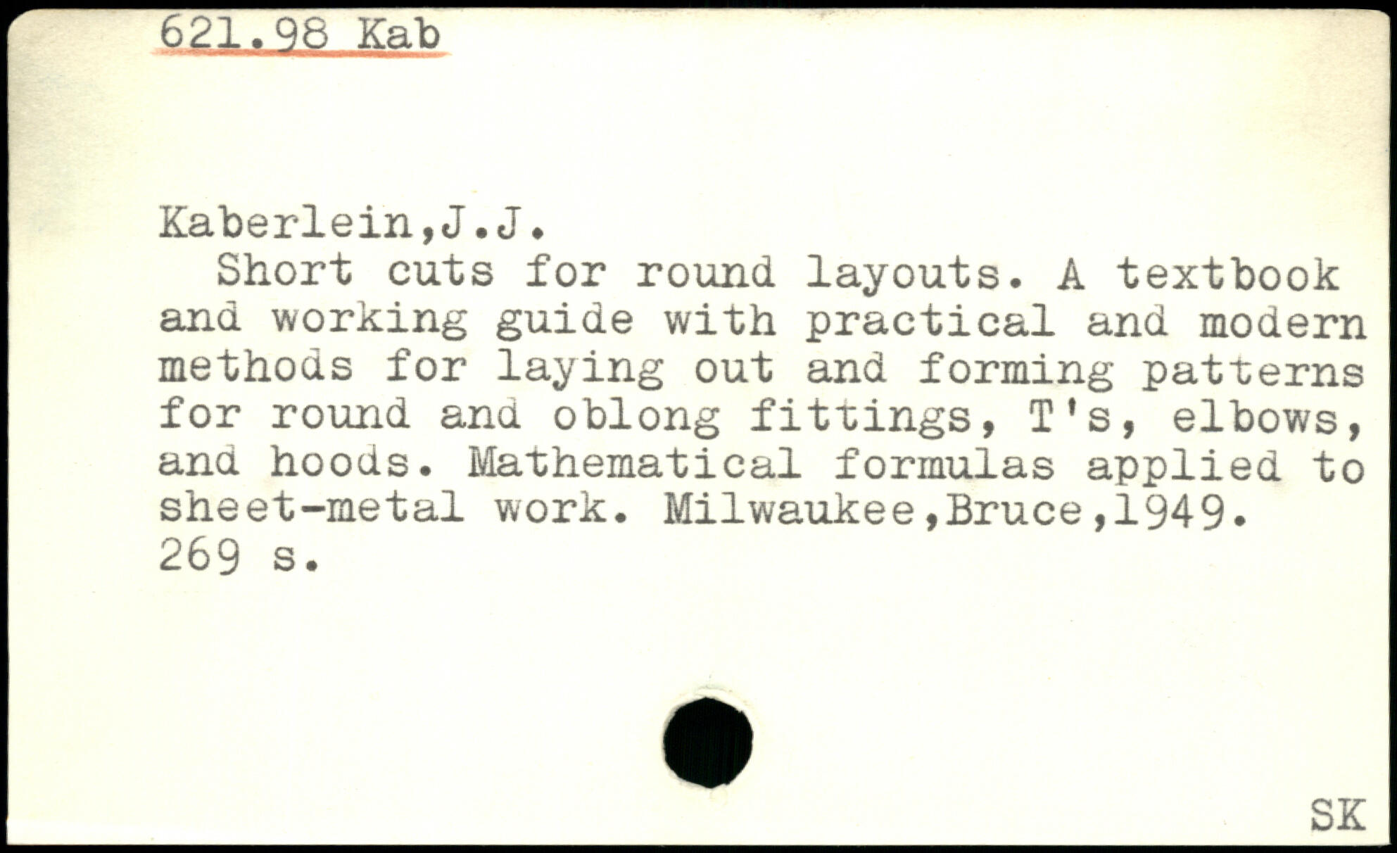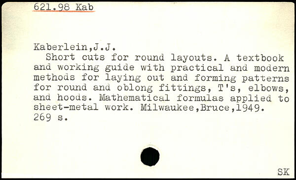 Short cuts for round layouts. A textbook and working guide with practical and modern methods for laying out and forming patterns for round ana oblong fittings, T's, elbows, ana hoods. Mathematical formulas applied to sheet-metal work.