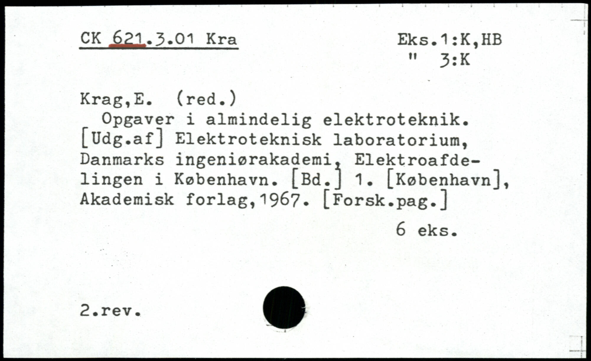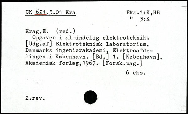 Opgaver i almindelig elektroteknik. [Udg.af] Elektroteknisk laboratorium, Danmarks ingeniørakademi, Elektroafde-lingen i København. [Bd.J 1.