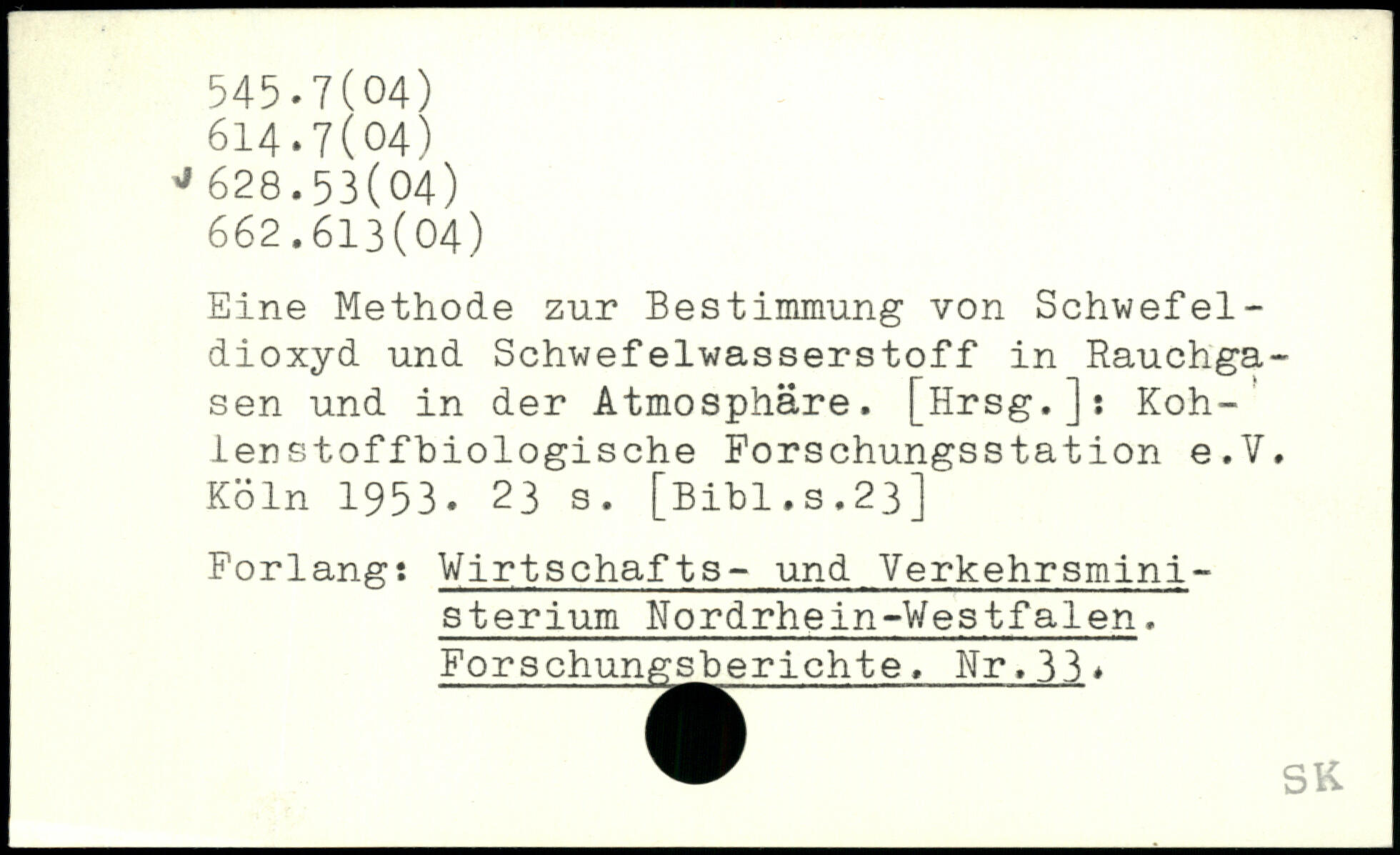 Eine Methode zur Bestimmung von Schwefeldioxyd und Schwefelwasserstoff in Rauchgasen und in der Atmosphäre. [Hrsg.]: Kohlenstof fbiologische Forschungsstation e.V.