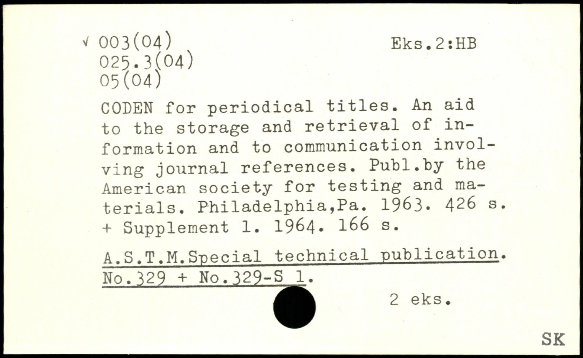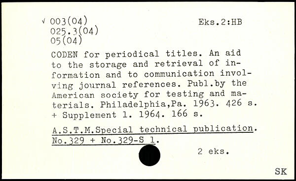 CODEN for periodical titles. An aid to the storage and retrieval of information and to communication involving journal references.