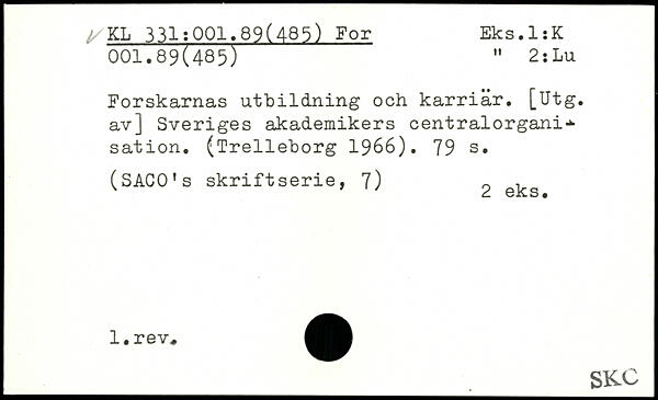 Forskarnas utbildning och karriär. [Utg. av] Sveriges akademikers centralorgani-.-sation. (Trelleborg 1966).