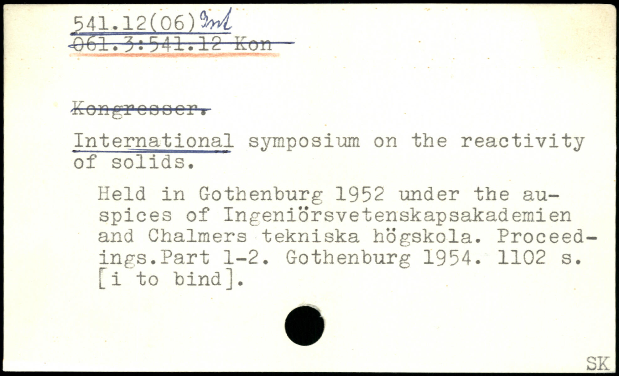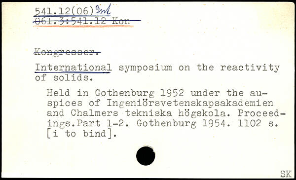 -Kongr-ee-oeri International symposium on the reactivity of solids. Held in Gothenburg 1952 under the auspices of Ingeniörsvetenskapsakademien and Chalmers tekniska högskola. Proceedings. Part 1-2. Gothenburg 1954.