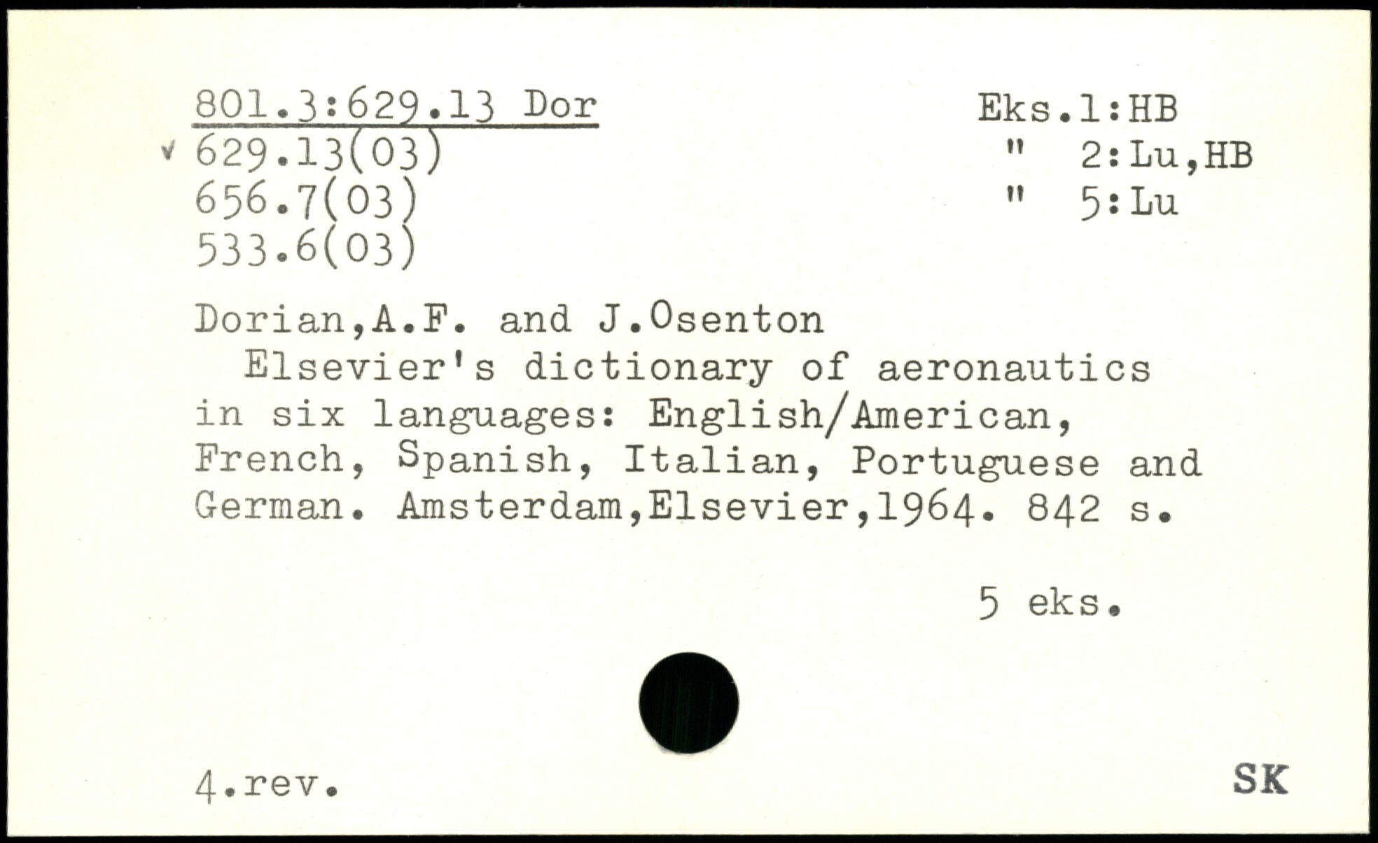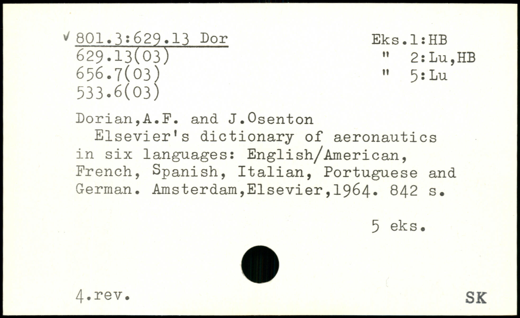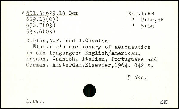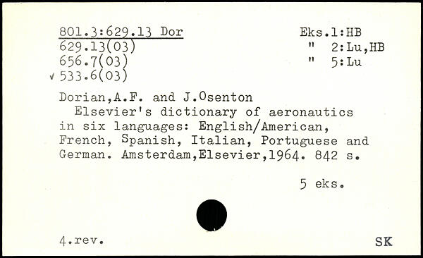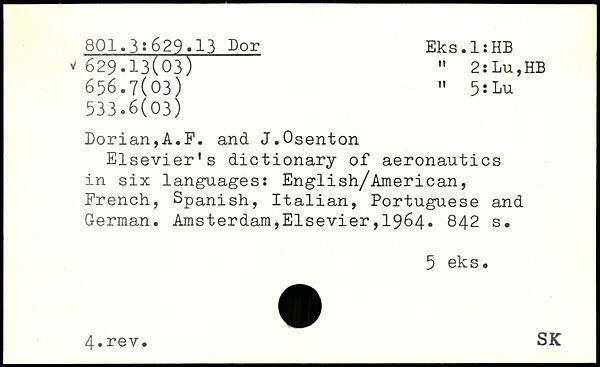 Elsevier's dictionary of aeronautics in six languages: English/American, French, Spanish, Italian, Portuguese and German.