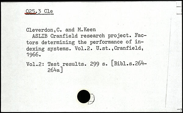 ASLIB Cranfield research project. Factors determining the performance of indexing systems.