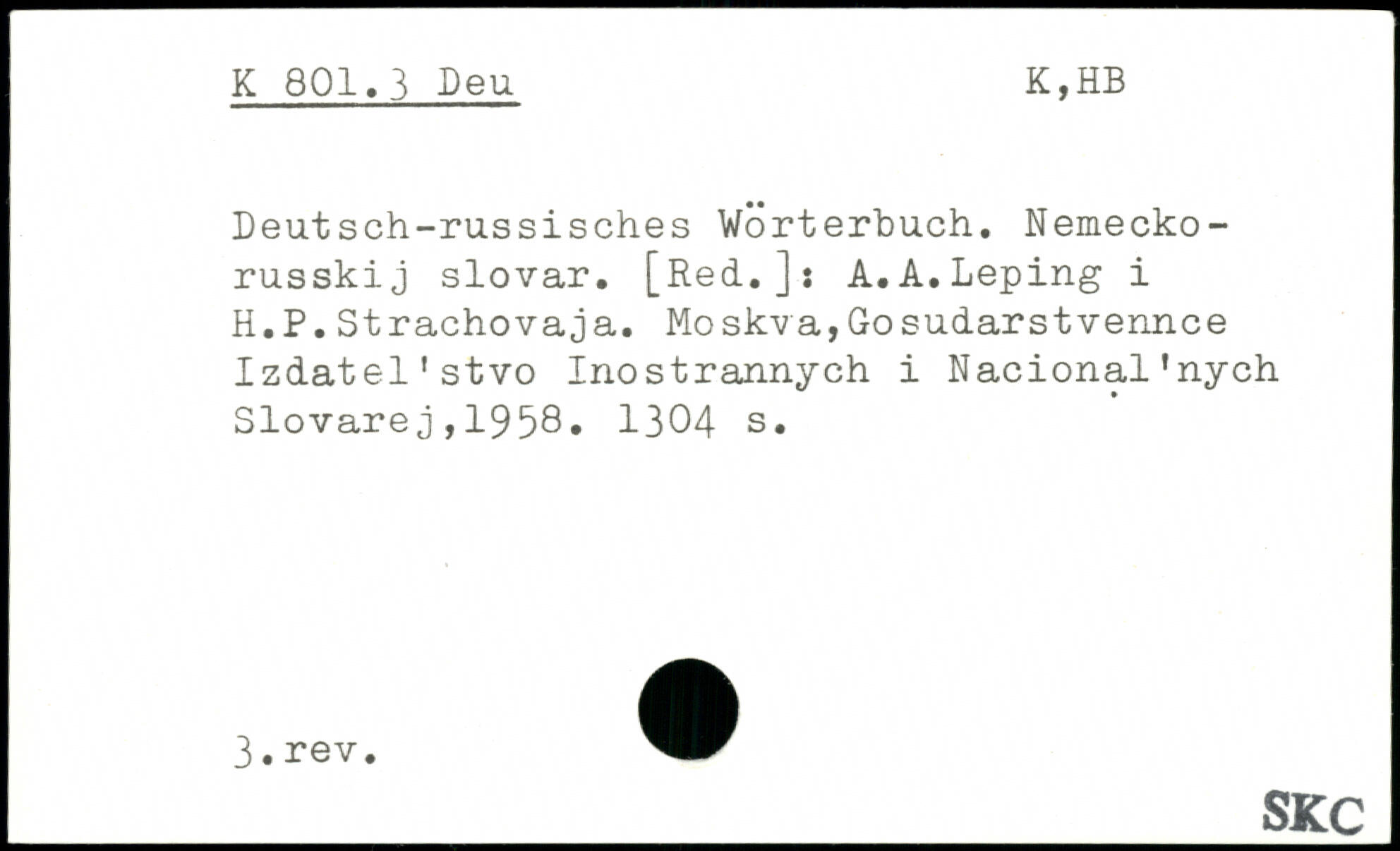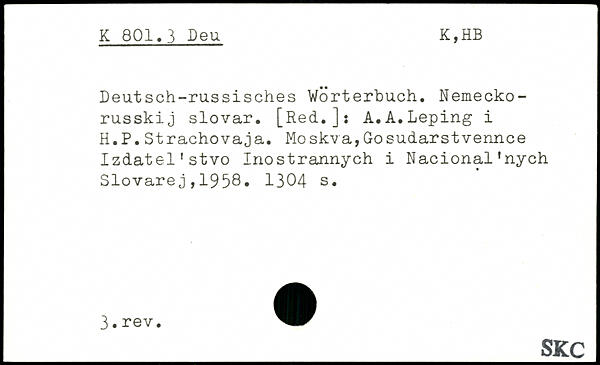 Deutsch-rassisches Wörterbuch. Nemecko-russkij slovar. [Red.]: A.A.Leping i H.P.Strachovaja. Moskva,Gosudarstvennce Izdatel'stvo Inostrannych i Nacional’nych Slovarej,1958
