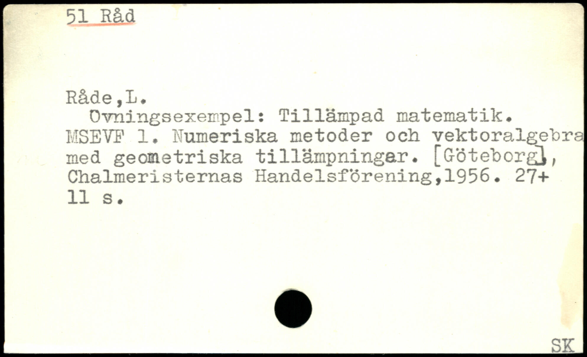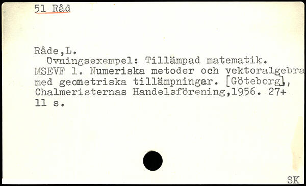 Övningsexempel: Tillämpad matematik. MSEVF 1. Numeriska metoder och vektoralgelora med geometriska tillämpningar. [Göteborg!, Chalmeristernas Handelsförening,1956. 27+