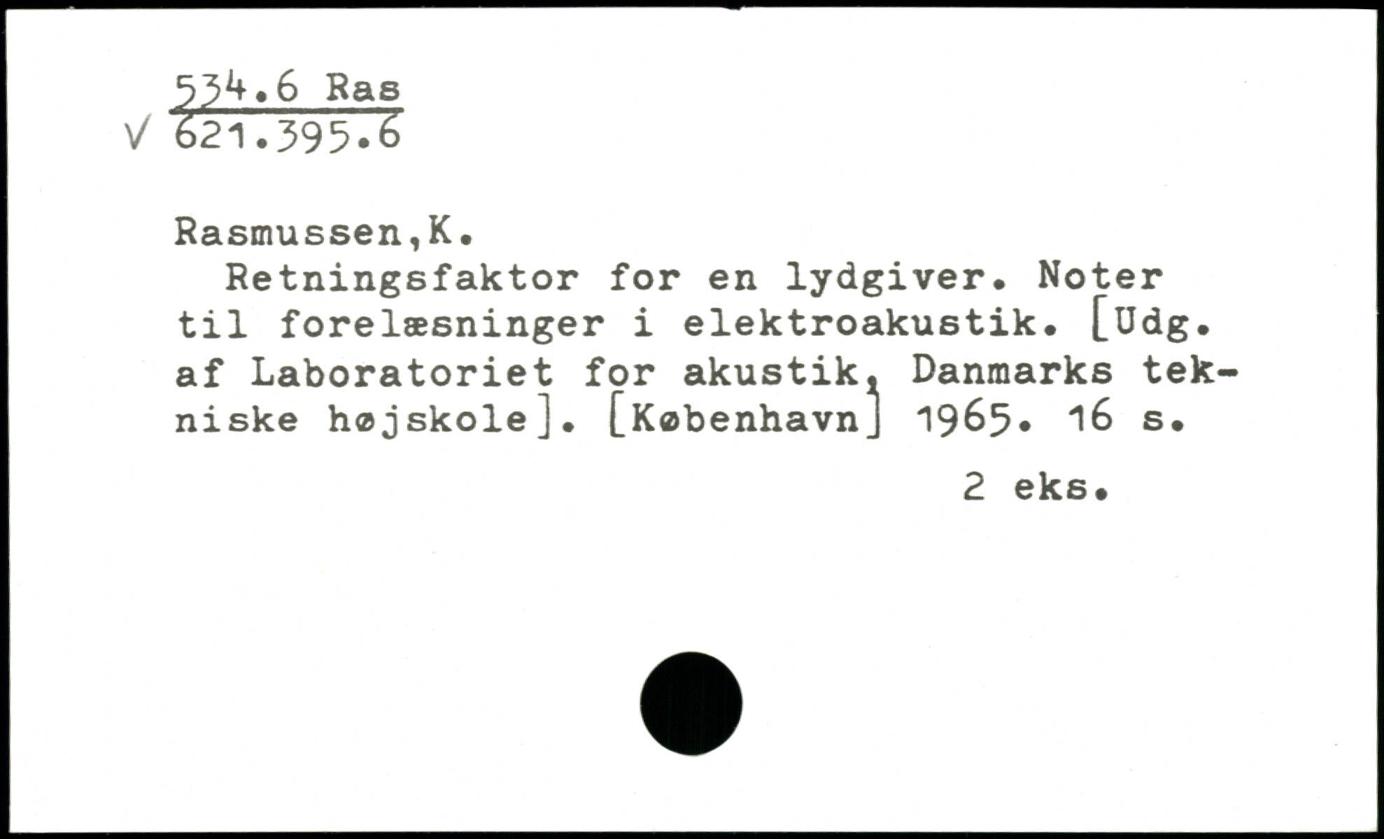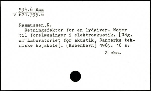 Retningsfaktor for en lydgiver. Noter til forelæsninger i elektroakustik. [Udg. af Laboratoriet for akustik. Danmarks tekniske hajskole]. [København] 19^5.