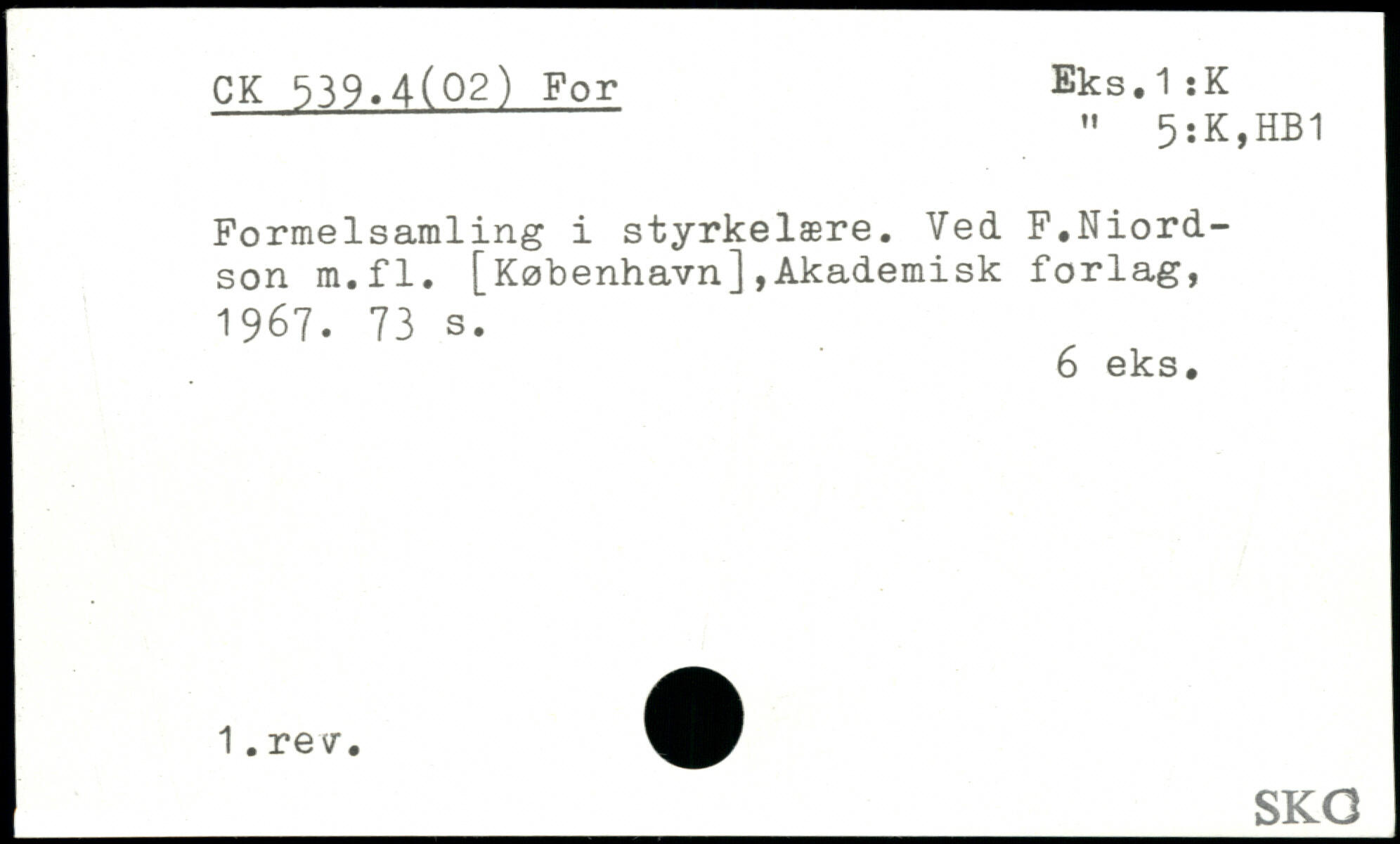- " 5 .. K, HB1 Formelsamling i styrkelære. Ved F.Niord-son m.fl. [København],Akademisk forlag, 1967.