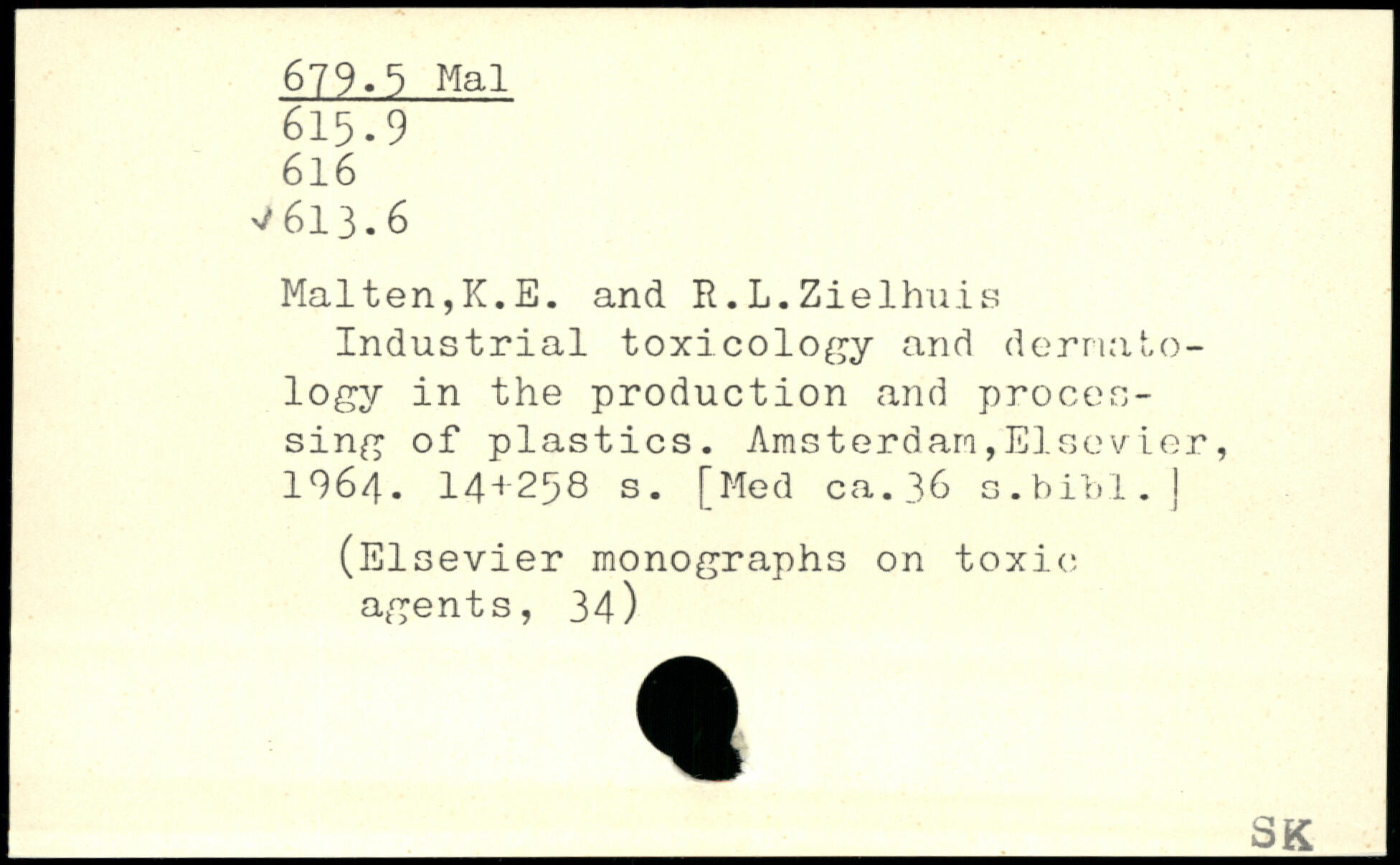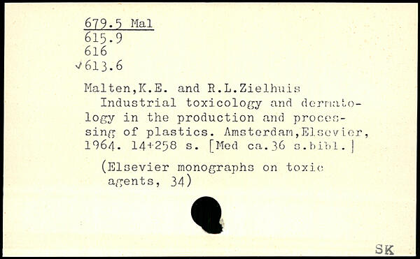 Industrial toxicology and derrmto- I logy in the production and procès- ; sing of plastics. Amsterdam,Elsevior, : 1964.