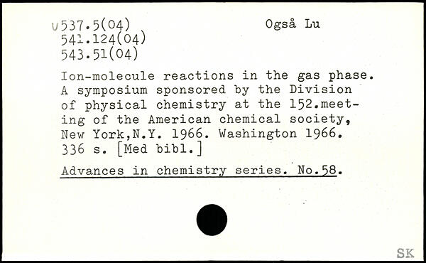 Ion-molecule reactions in the gas phase. A symposium sponsored hy the Division of physical chemistry at the 152.meeting of the American chemical society, New York,N.Y. 1966.