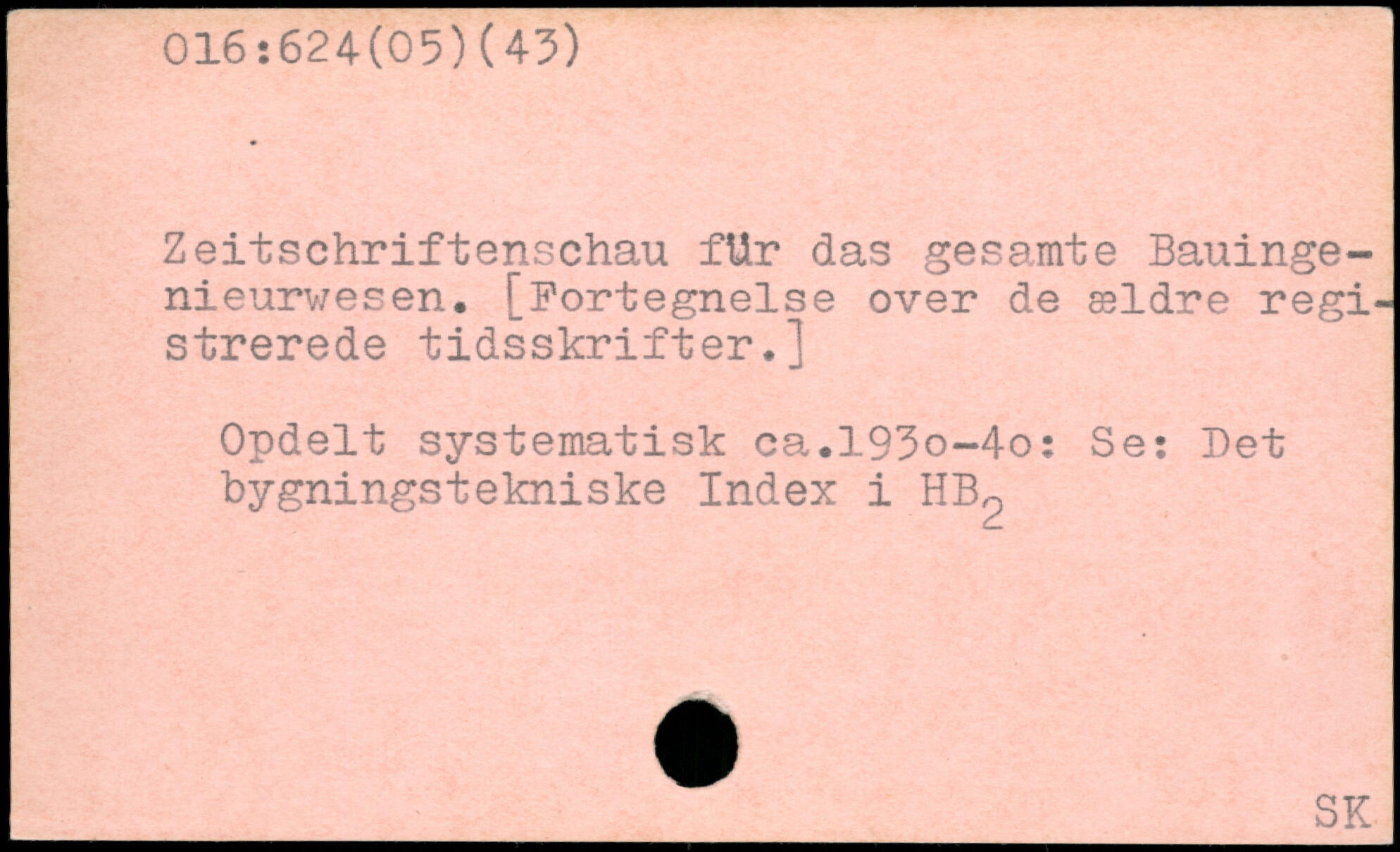 Zeitschriftenschau fUr das gesamte Bauinge-nieurwesen. [Fortegnelse over de ældre registrerede tidsskrifter.] Opdelt systematisk ca.l93o-4o: Se: Det bygningstekniske Index i HB?