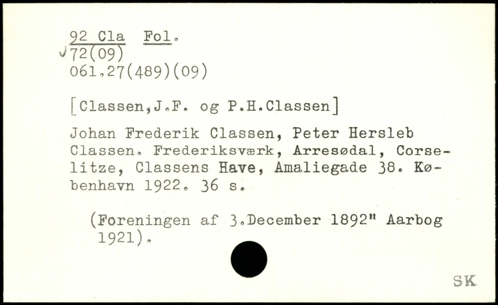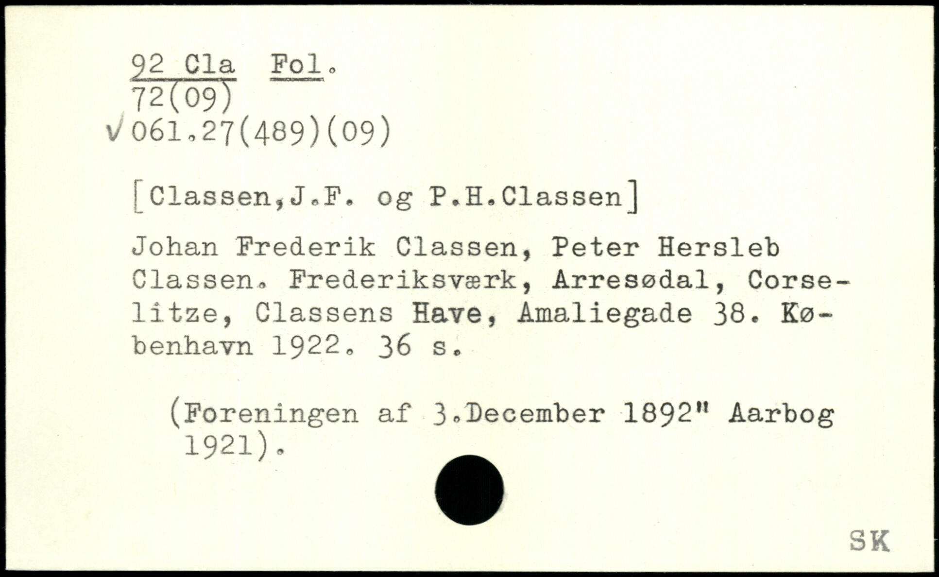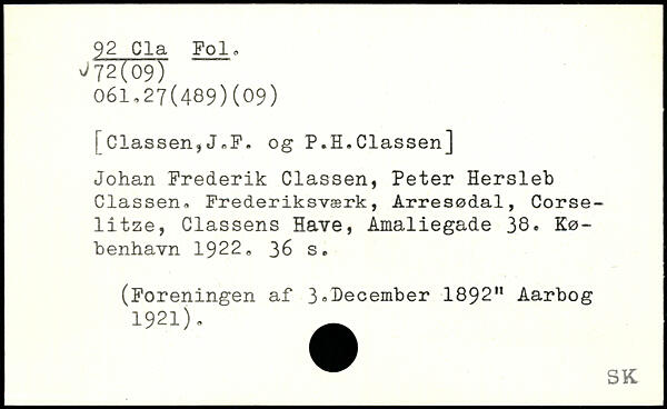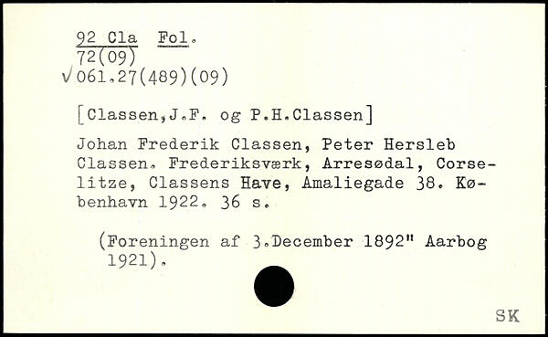 ! Classen,J,F. og P.H.Classen] Johan Frederik Classen, Peter Hersleb Classen, Frederiksværk, Arresødal, Corse-litze, Classens Have, Amaliegade 38.