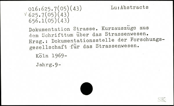 Dokumentation Strasse. Kurzauszüge aus dem Schrifttum über das Strassenwesen. Hrsg.: Dokumentationsstelle der Forschungs gesellschaft für das Strassenwesen.