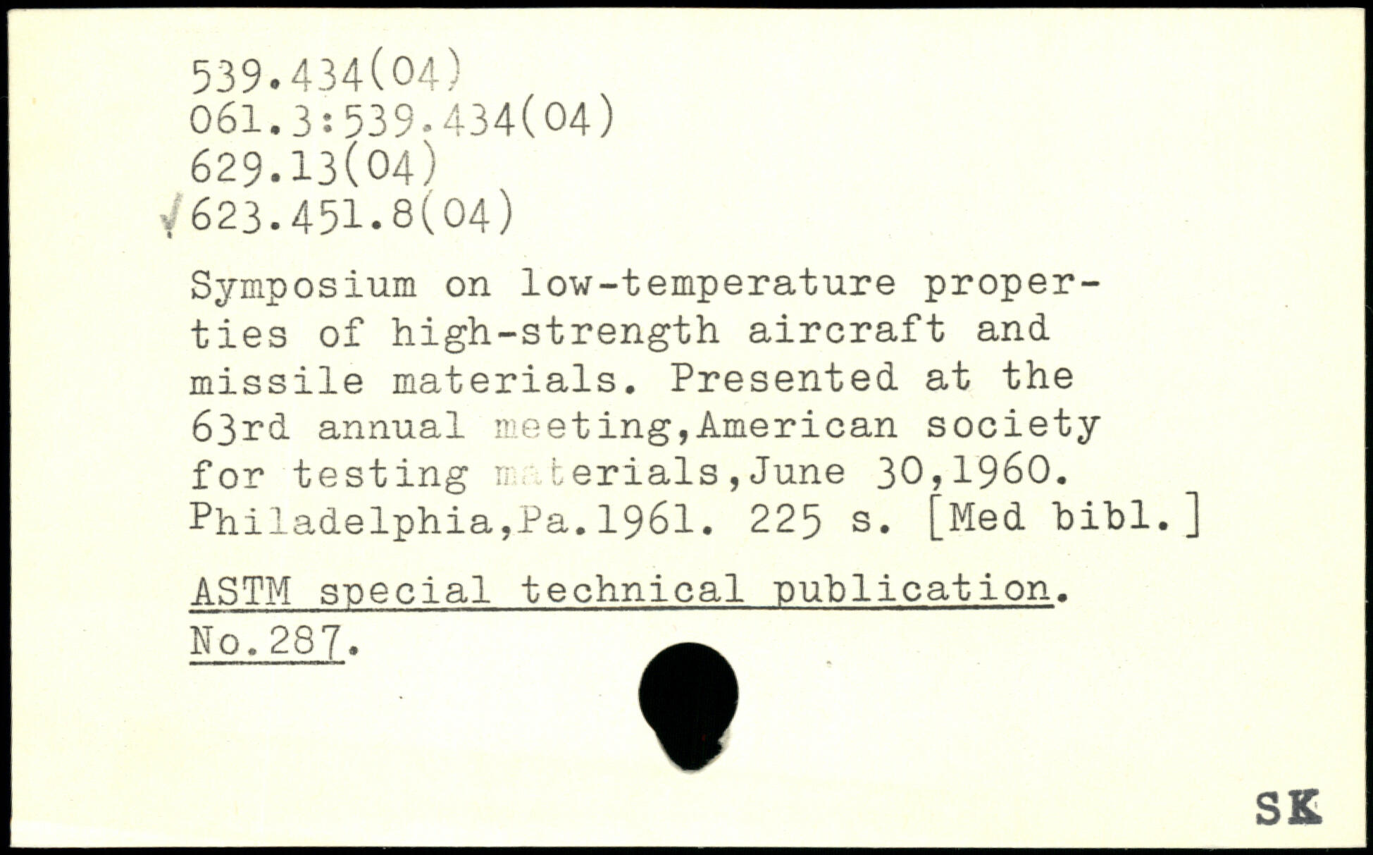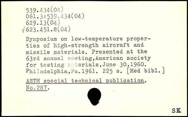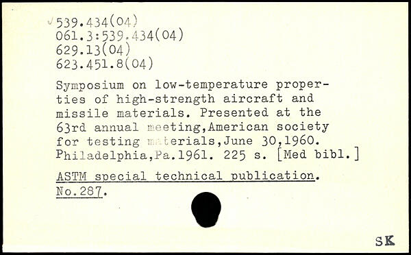 Symposium on low-temperature properties of high-strength aircraft and missile materials. Presented at the 63rd annual meeting,American society for testing ri terials , June 30,1960. Philadelphia,Pa.1961.