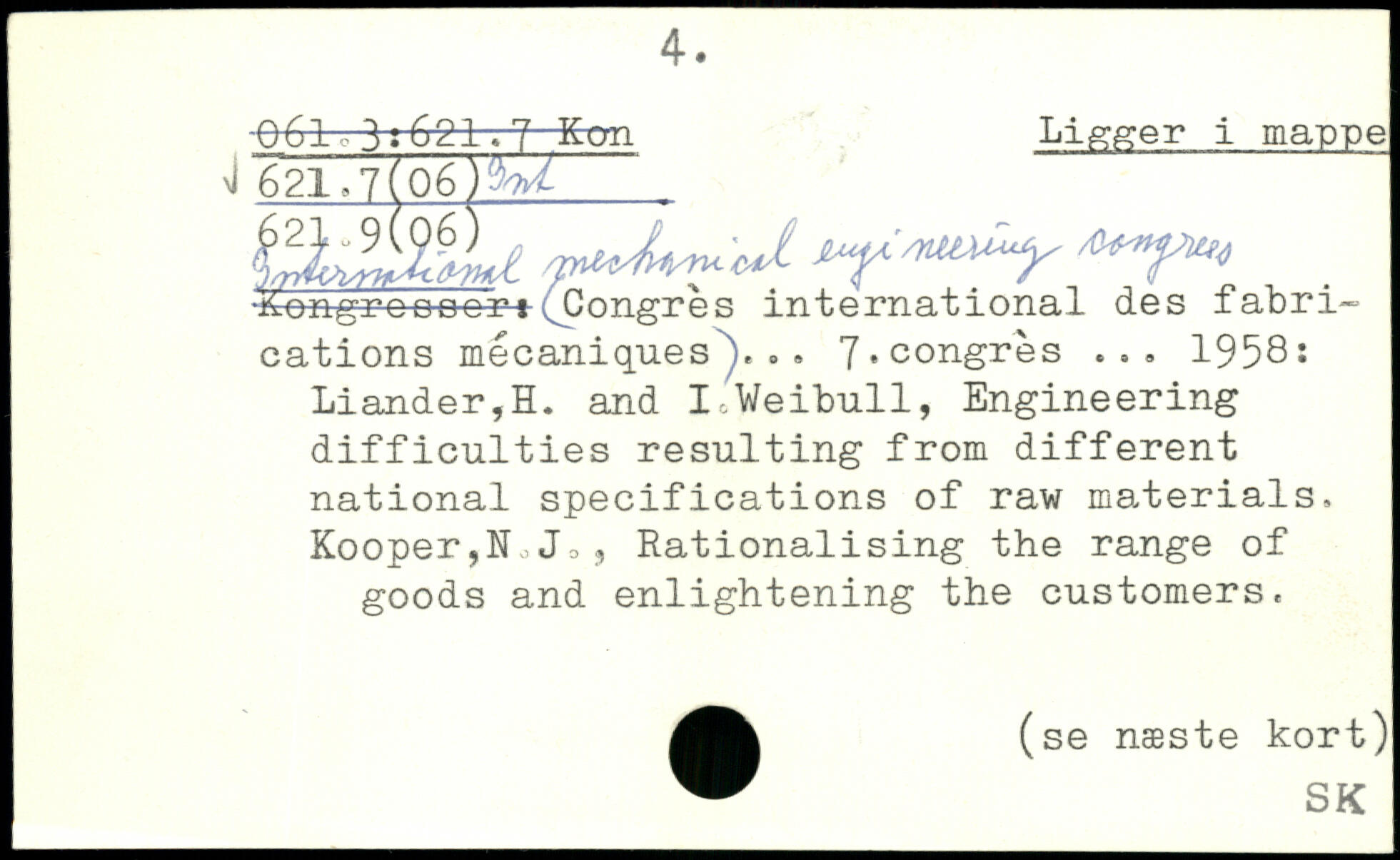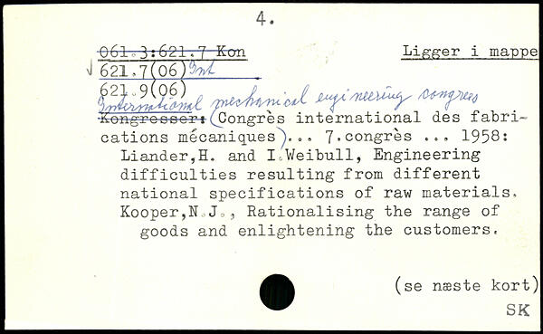 -06l 3:621.7 'Kon Ligger i mappe 4 621,7(06 )%'t k3,;ÈÊLl V.df, n,'J. ^ongroocori^Congres international des fabrications mécaniques')... 7,congrès ... 1958: Liander,ïï. and I-.Weibull, Engineering difficulties resulting from different national specifications of raw materials, Kooper,N,Jo, Rationalising the range of goods and enlightening the customers. .(se næste kort)