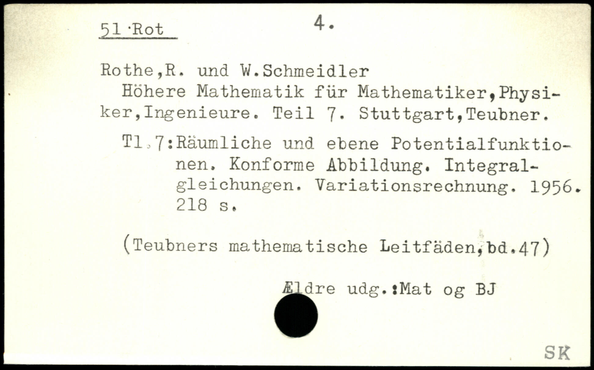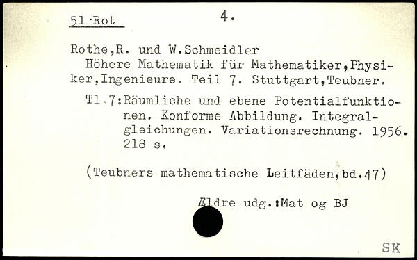 Höhere Mathematik für Mathematiker,Physiker ,Ingenieure. Teil 7. Stuttgart,Teubner, Tl,7:Räumliche und ebene Potentialfunktionen, Konforme Abbildung, Integralgleichungen. Variationsrechnung. 1956.