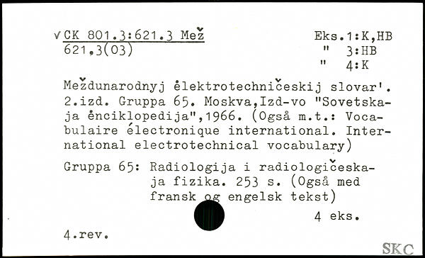 Mezdunarodnyj elektrotechniceskij slovar'. 2.izd. Gruppa 65. Moskva,Izd-vo "Sovetska-ja ênciklopedija",1966. (Også m.t.: Vocabulaire électronique international. International electrotechnical vocabulary) Gruppa 65: Radiologija i radiologiceska-ja fizika.