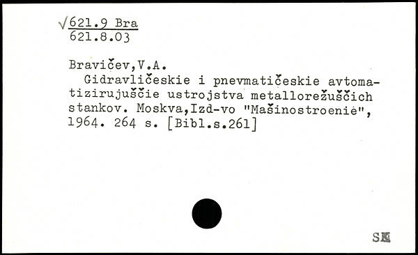 Gidravliceskie i pnevmaticeskie avtoma-tizirujuscie ustrojstva metallorezuscich stankov. Moskva,Izd-vo "Masinostroenie", 1964.