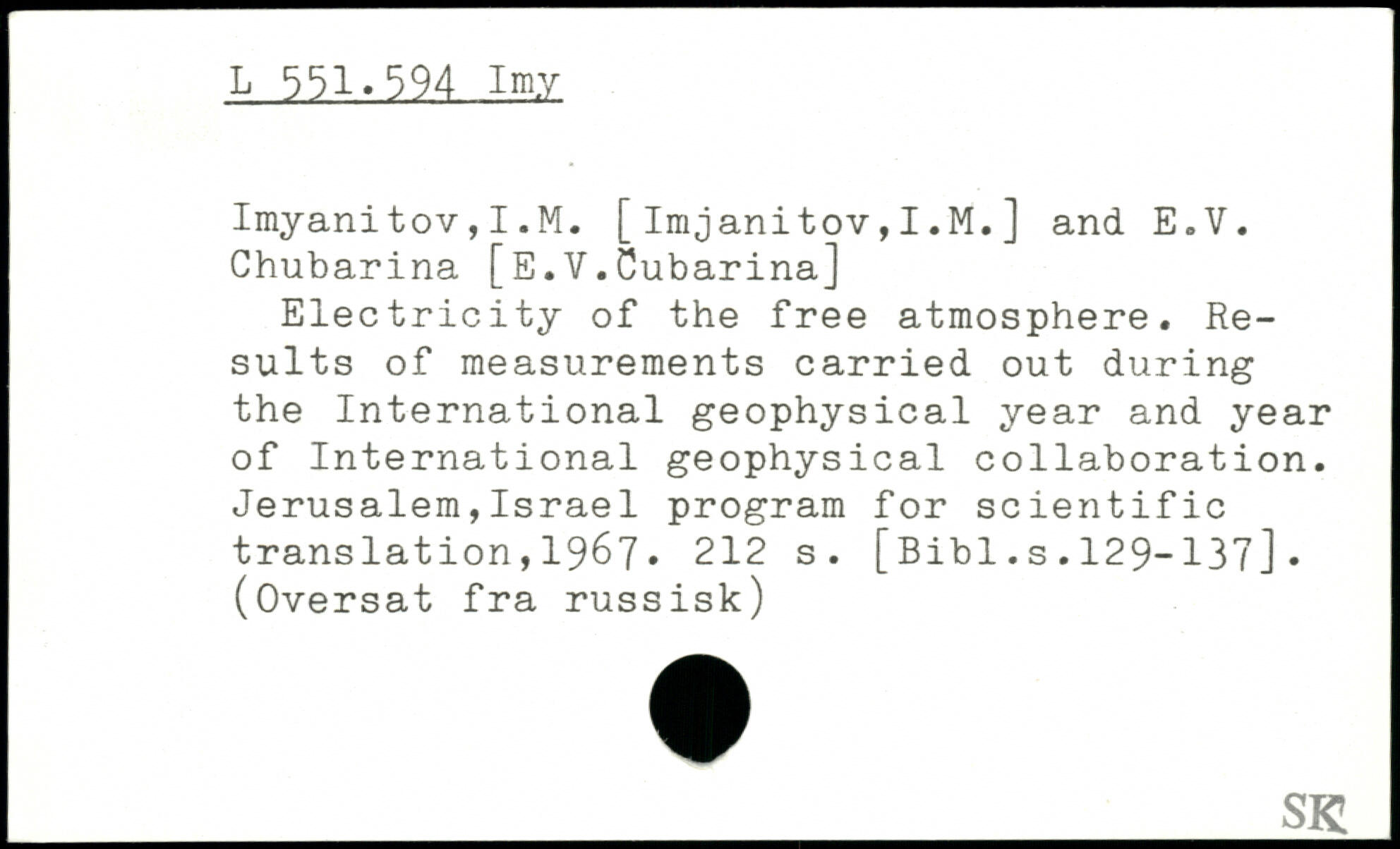 Imyanitov,I.M. [Imjanitov,I.M.] and E.V. Chubarina [E.V.Cubarina] Electricity of the free atmosphere. Results of measurements carried out during the International geophysical year and year of International geophysical collaboration. Jerusalem,Israel program for scientific translation,1967.