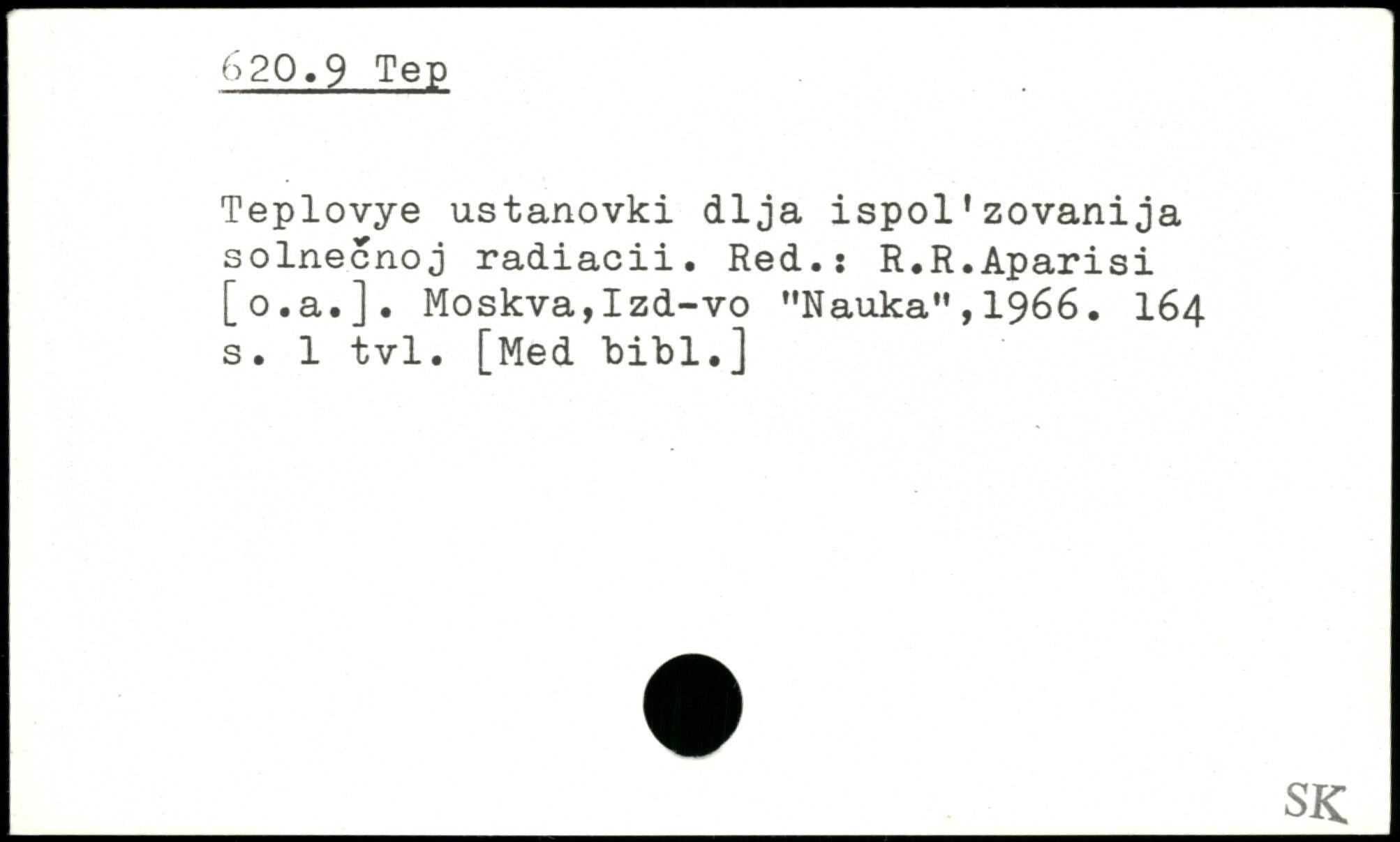 Teplovye ustanovki dlja ispol'zovanija solnecnoj radiacii. Red.: R.R.Aparisi [o.a.]. Moskva,Izd-vo "Nauka",1966, I
