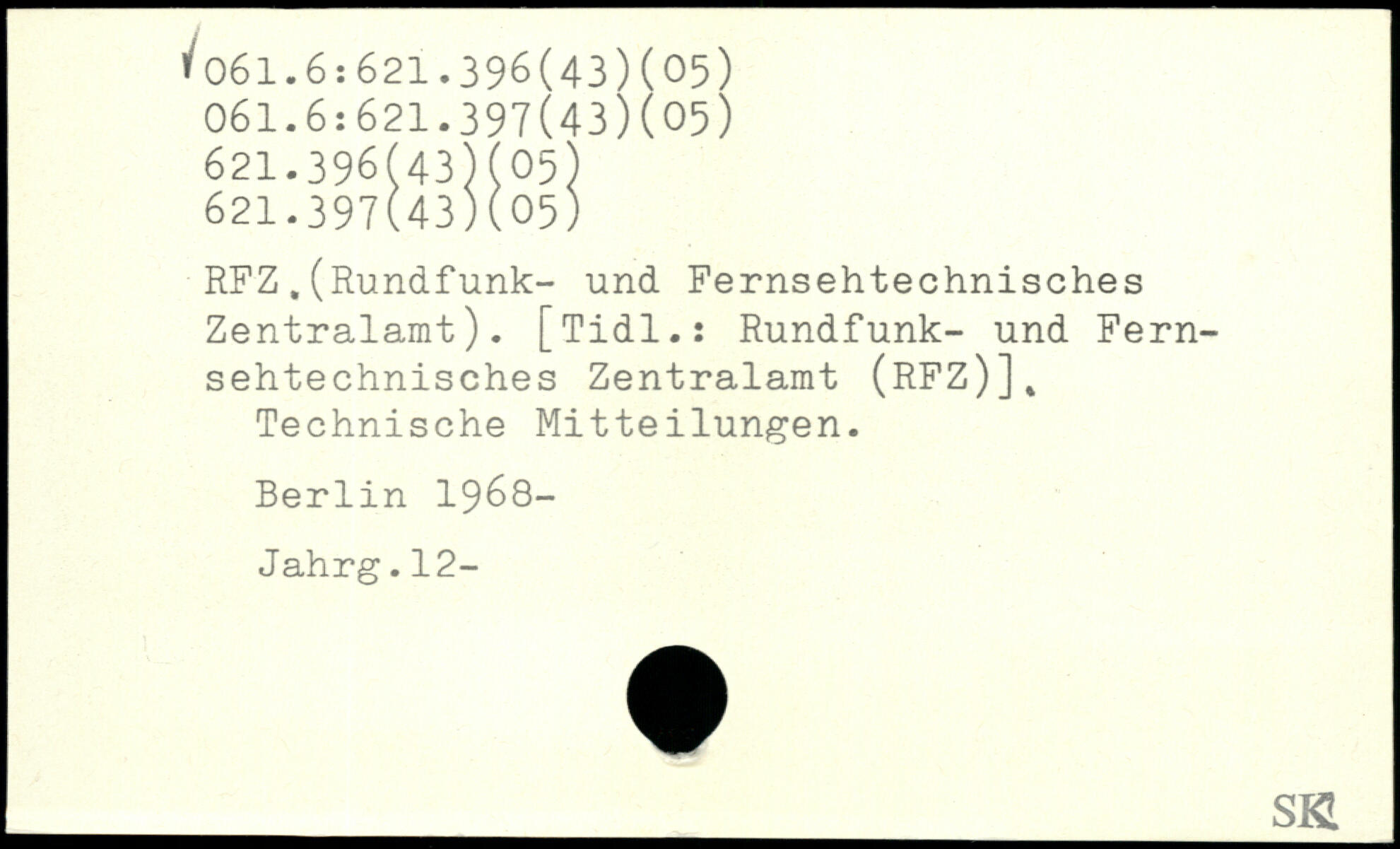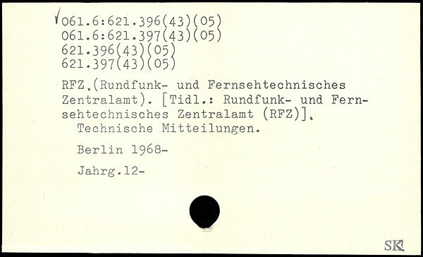 RFZ. (Rundfunk- und Fernsehtechnisches Zentralamt). [Tidl.: Rundfunk- und Fernsehtechnisches Zentralamt (RFZ)]% Technische Mitteilungen.