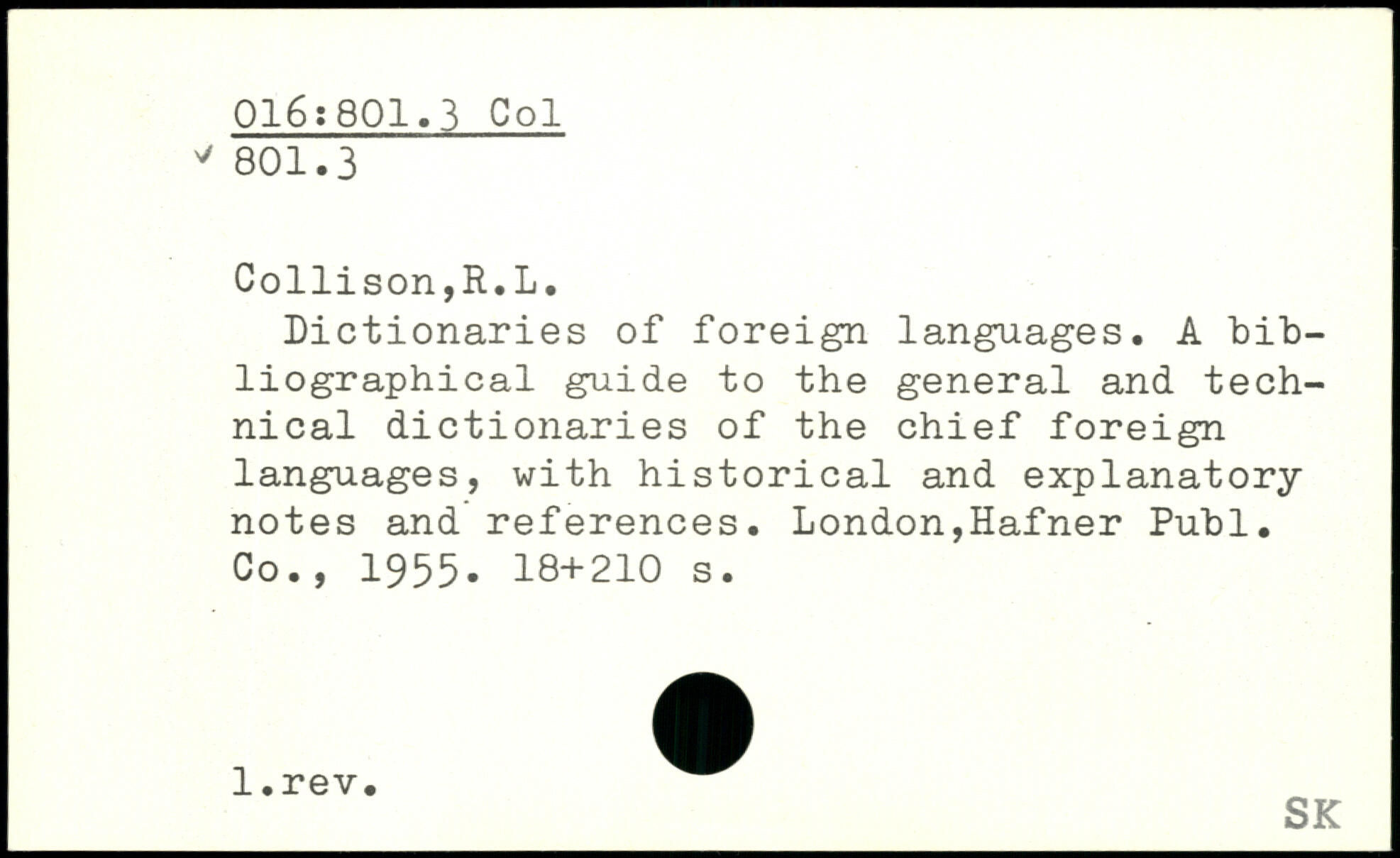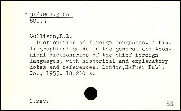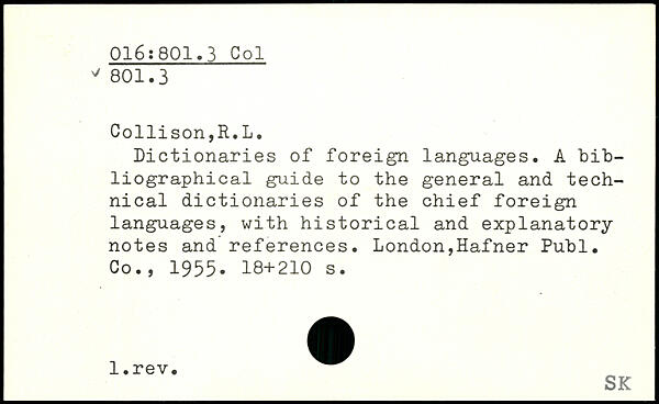 Dictionaries of foreign languages. A bibliographical guide to the general and technical dictionaries of the chief foreign languages, with historical and explanatory notes and references. London,Hafner Publ. Co., 1955.