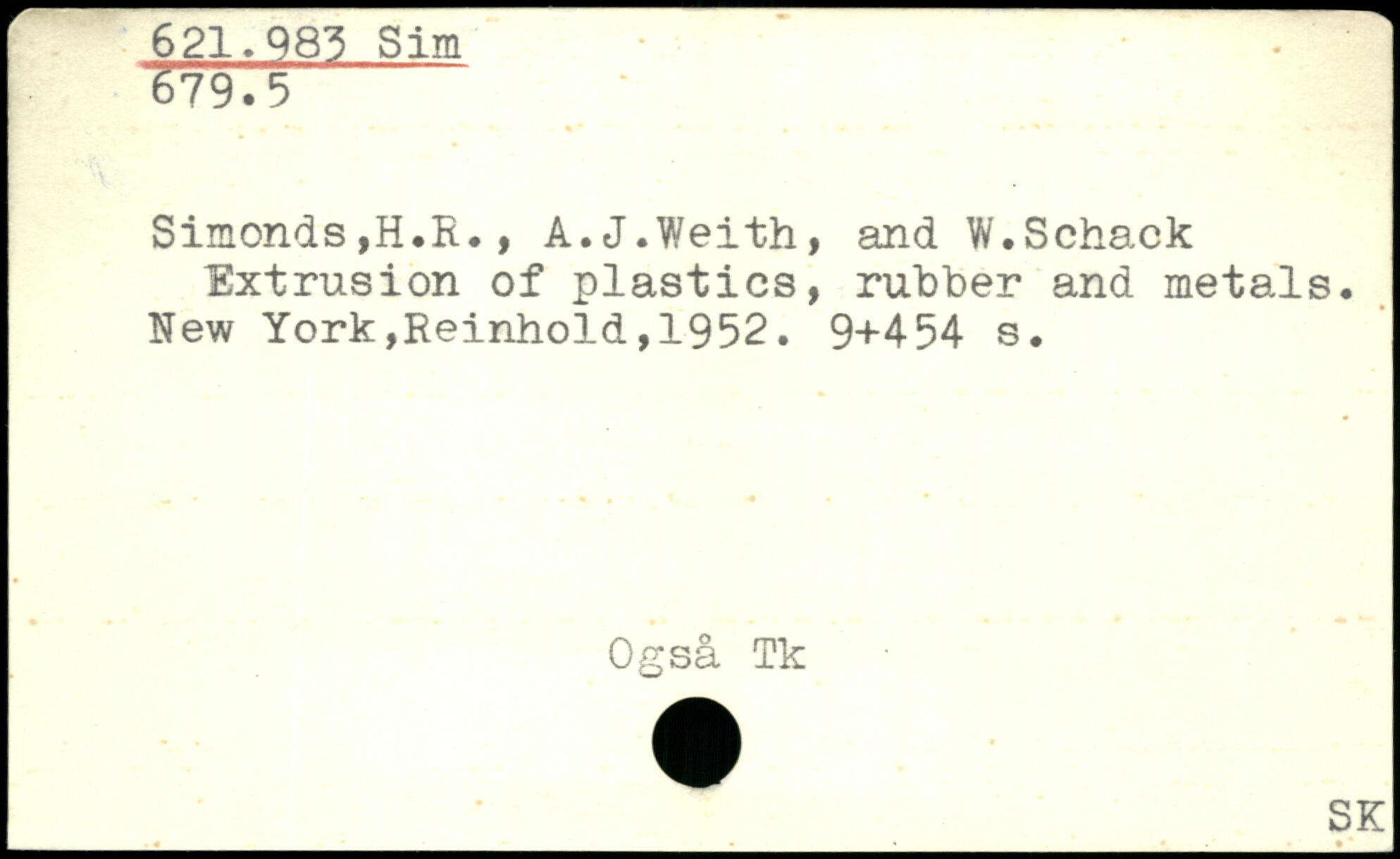 Simonds,H.K., A.J.Weith, and W.Schack Extrusion of plastics, rubber and metals.