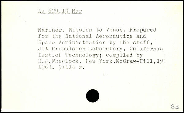Mariner. Mission to Venus. Prepared for the National Aeronautics and Space Adrriini strati on by the staff, Jet Propulsion Laboratory, California Inst, of Technology; coir pi led by I;. J. Wheelock. New York, KcGraw-Ki 11,1 CJ( 1 f, 63- 9 +