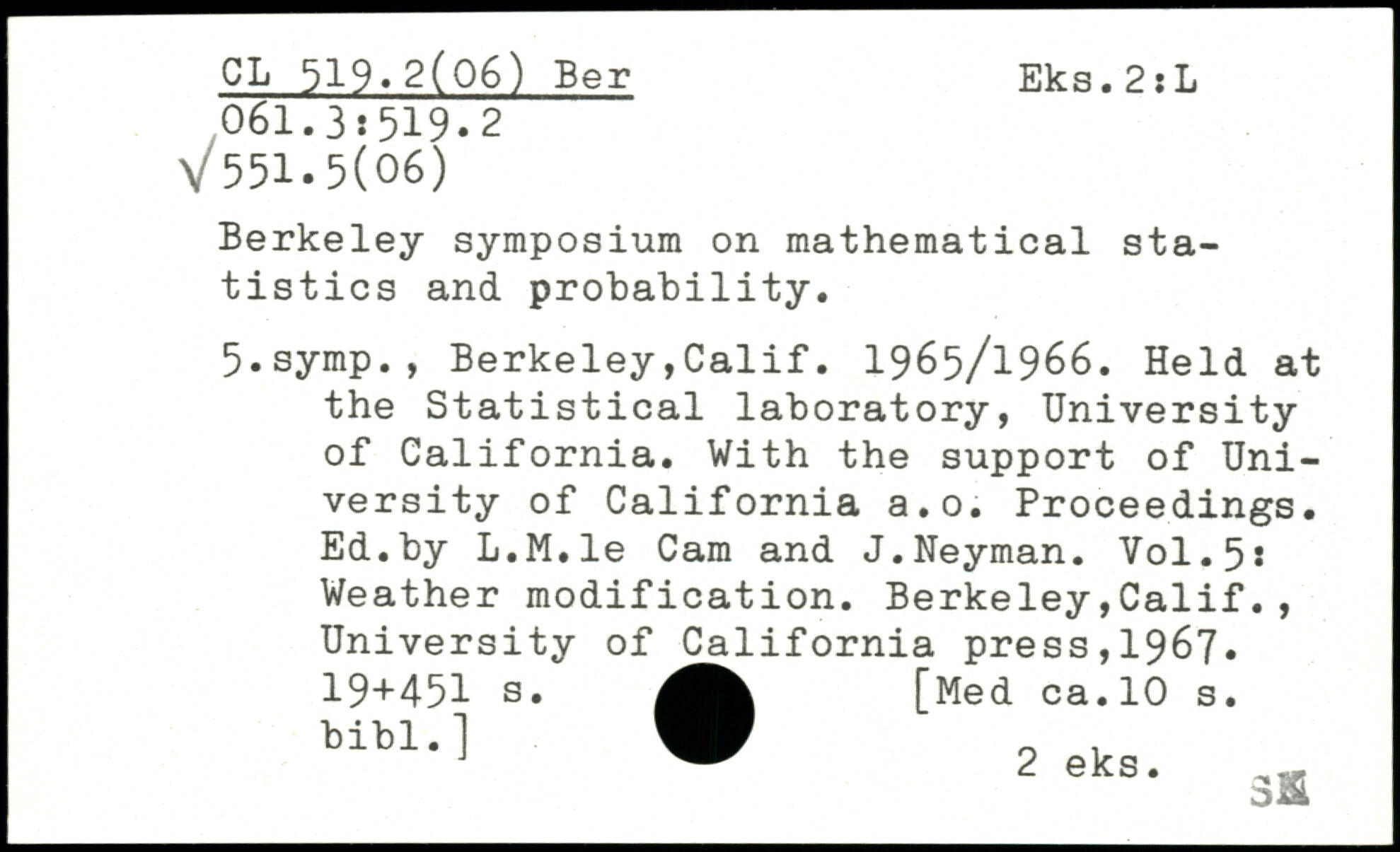Berkeley symposium on mathematical statistics and probahility. 5.symp., Berkeley,Calif. 1965/1966. Held at the Statistical laboratory, University of California. With the support of University of California a.o. Proceedings. Ed.by L.M.le Cam and J.Neyman.
