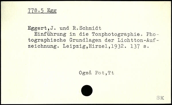 Einführung in die Tonphotographie, Photographische Grundlagen der Lichtton-Auf-Zeichnung, Leipzig,Hirzel,1932. 137 s. Også Fot,Tt