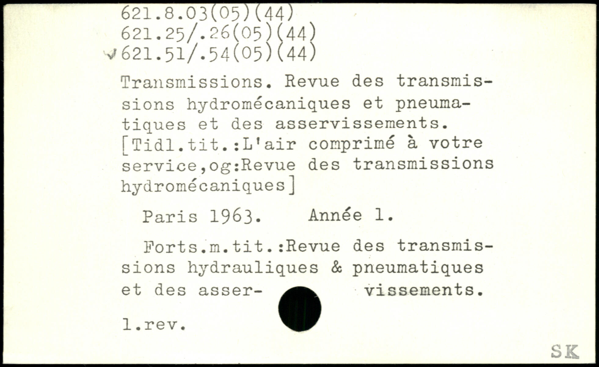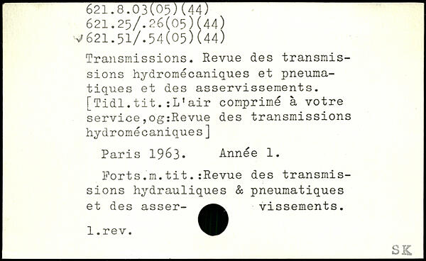 Transmissions. Revue des transmissions hydromécaniques et pneumatiques et des asservissements. [Tidl.tit.:L’air comprimé à votre service,og:Revue des transmissions hydromécaniques]