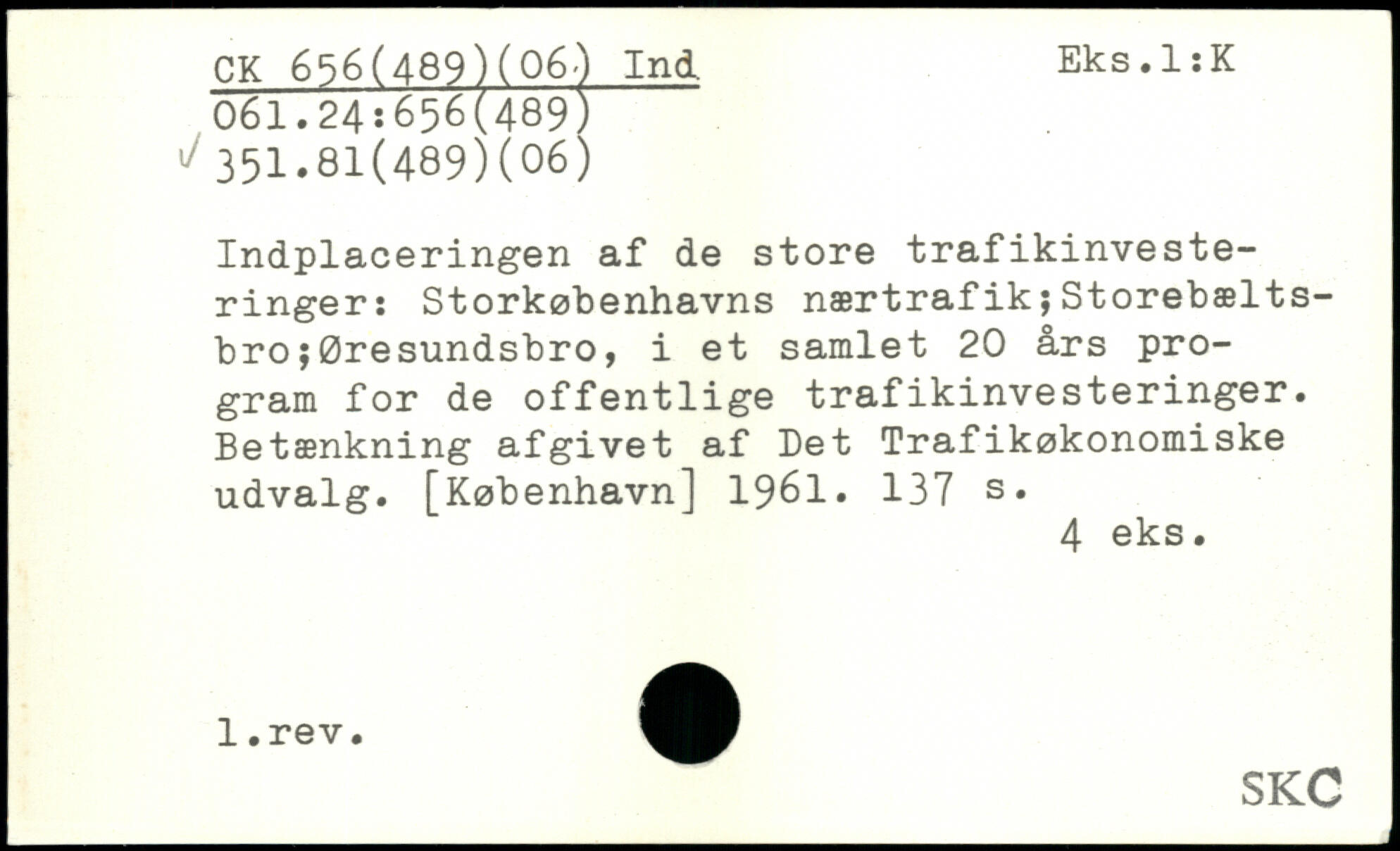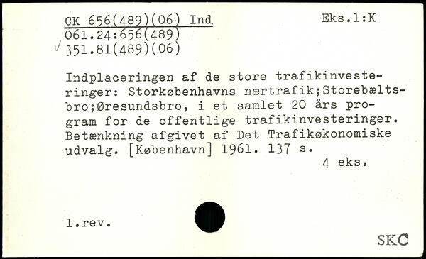 Indplaceringen af de store trafikinvesteringer: Storkøbenhavns nærtrafik;Storebæltsbro ;Øresundsbro, i et samlet 20 års program for de offentlige trafikinvesteringer. Betænkning afgivet af Det Trafikøkonomiske udvalg.