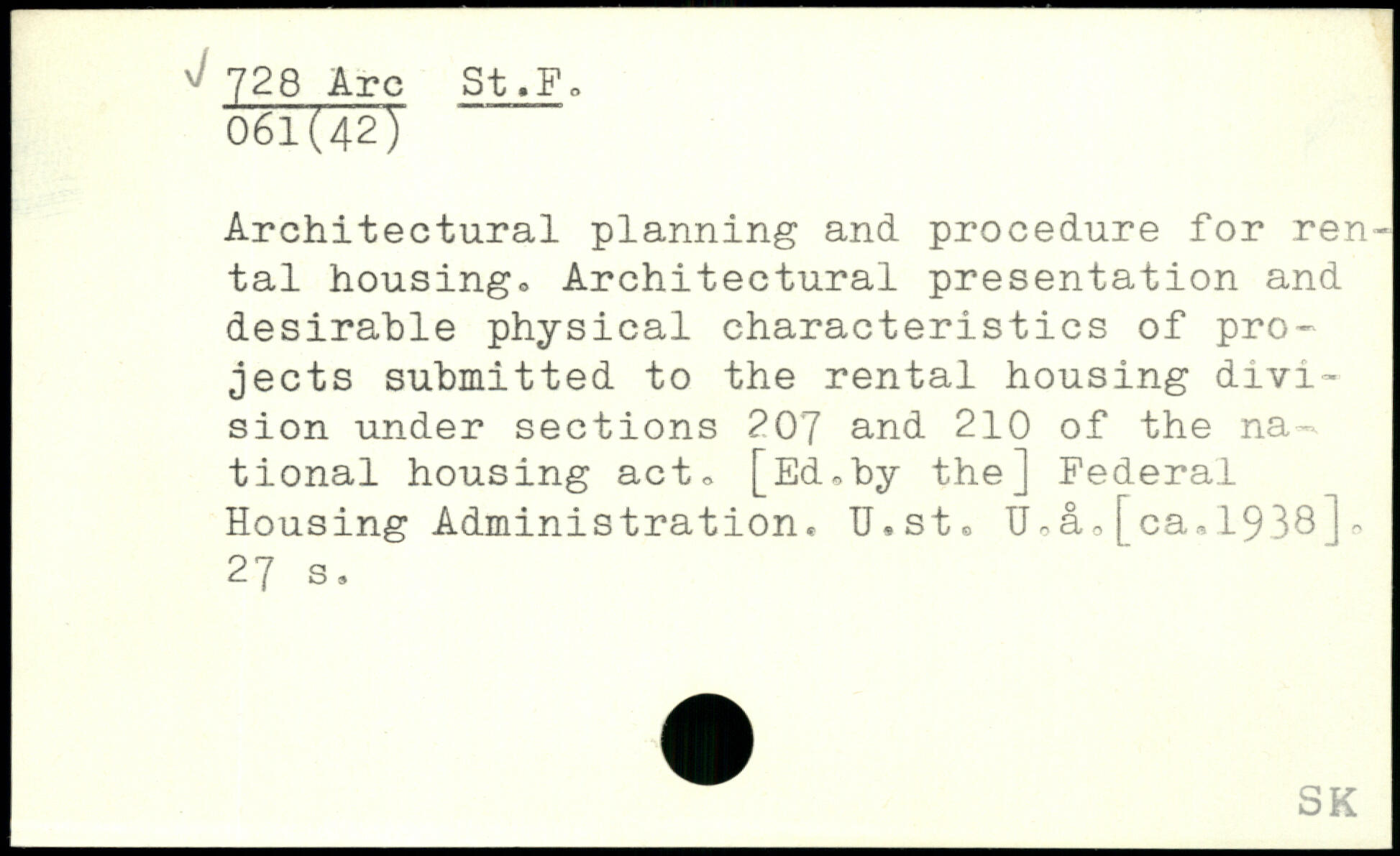 Architectural planning and procedure for rental housing., Architectural presentation and desirable physical characteristics of projects submitted to the rental housing division under sections 207 and 210 of the national housing act. [Ed,by the] Federal Housing Administration. TJ.st, U,[ca,1938]