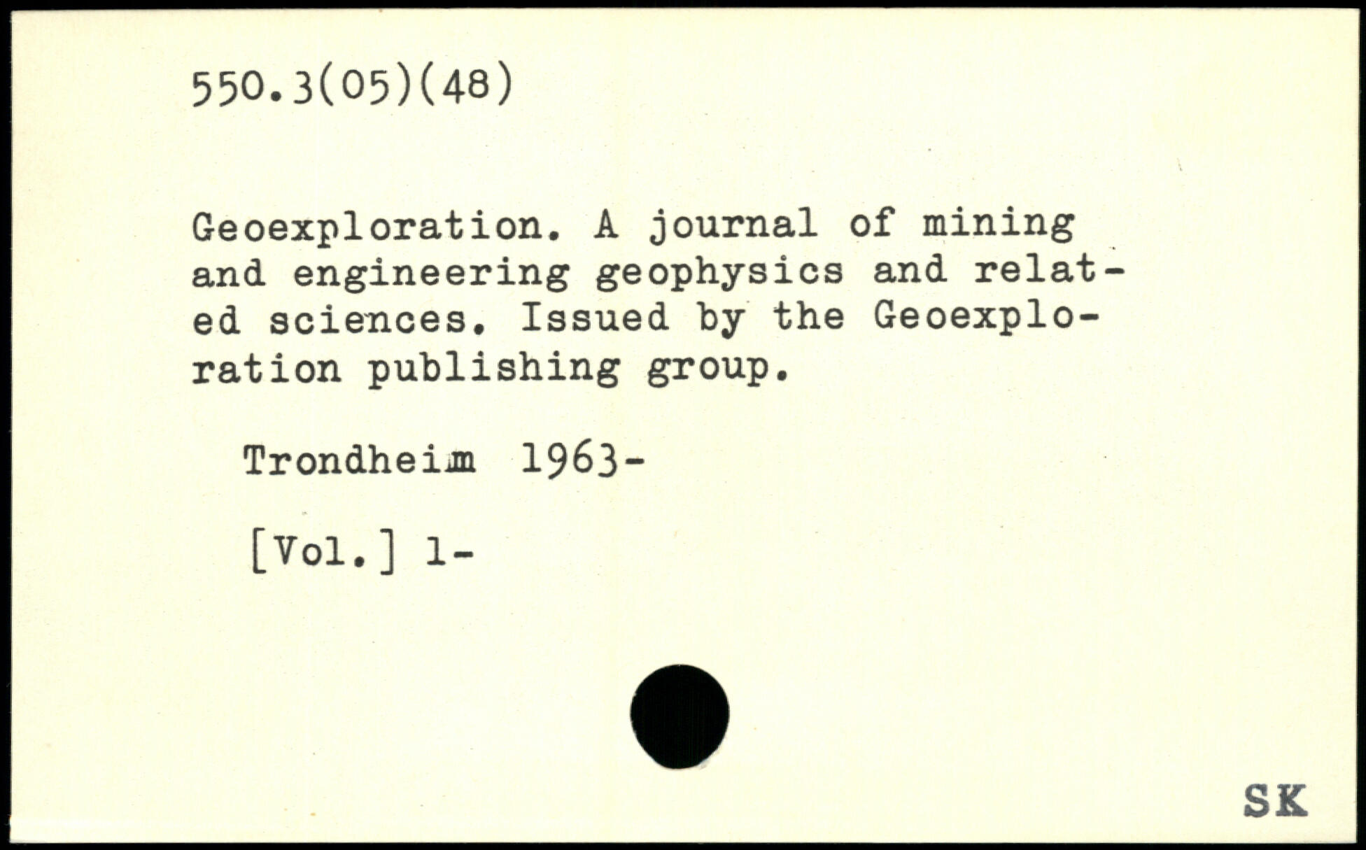 Geoexploration. A journal of mining and engineering geophysics and related sciences. Issued by the Geoexploration publishing group. Trondheijn 1963-