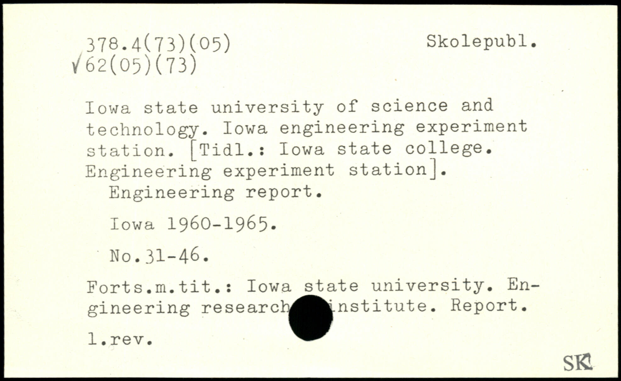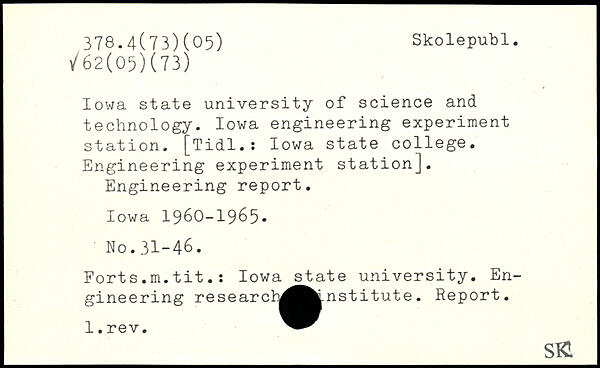 Iowa state university of science and technology. Iowa engineering experiment station. [Tidl.: Iowa state college. Engineering experiment station]. Engineering report. Iowa 1960-1965, Forts.m.tit.: Iowa state university. Engineering researct^^fcinstitute. Report. l.rev.