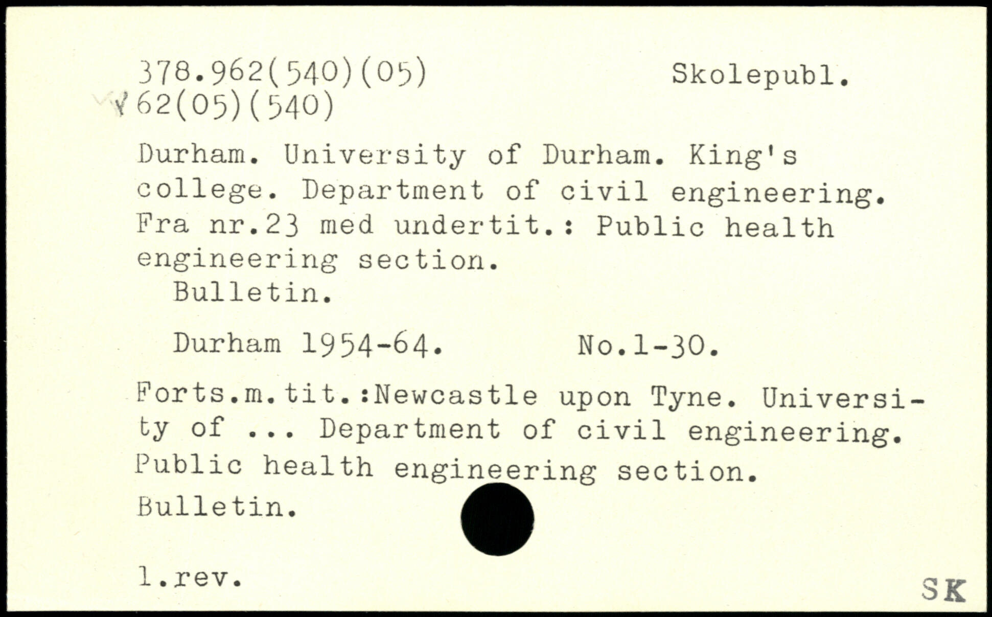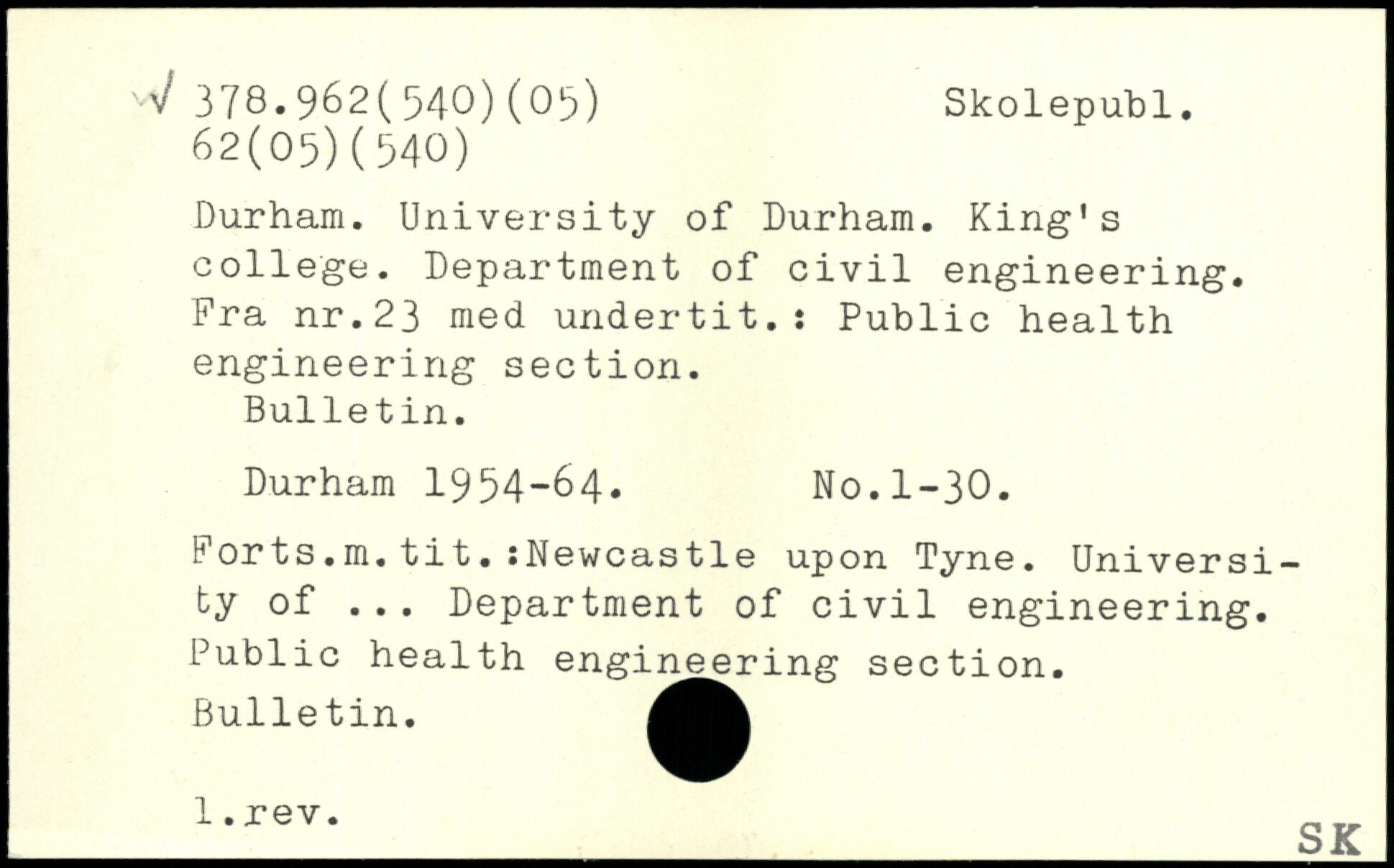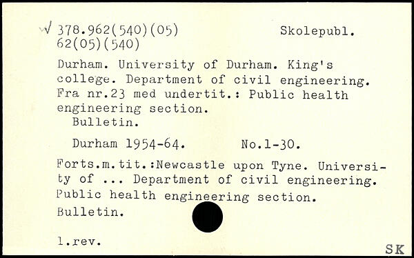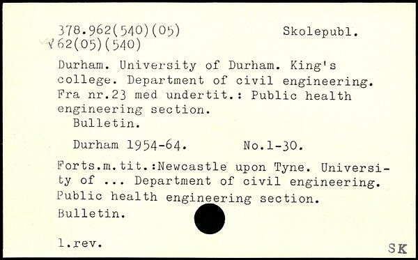 Durham. University of Durham. King’s college. Department of civil engineering. Fra nr.23 med undertit.: Public health engineering section. Bulletin. Durham 1954-64. No.1-30. Forts.m.tit.:Newcastle upon Tyne. University of ... Department of civil engineering. Public health engineering section. Bulletin. _1-rev-_3K